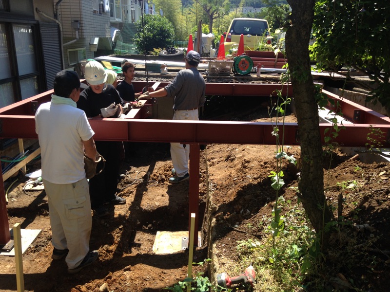 既存の駐車場と高さを合せて、工場で刻んできた鉄骨材を組み立てていきます。