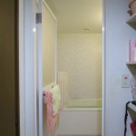 浴室の出入口の壁はアクセントクロスで仕上げました。