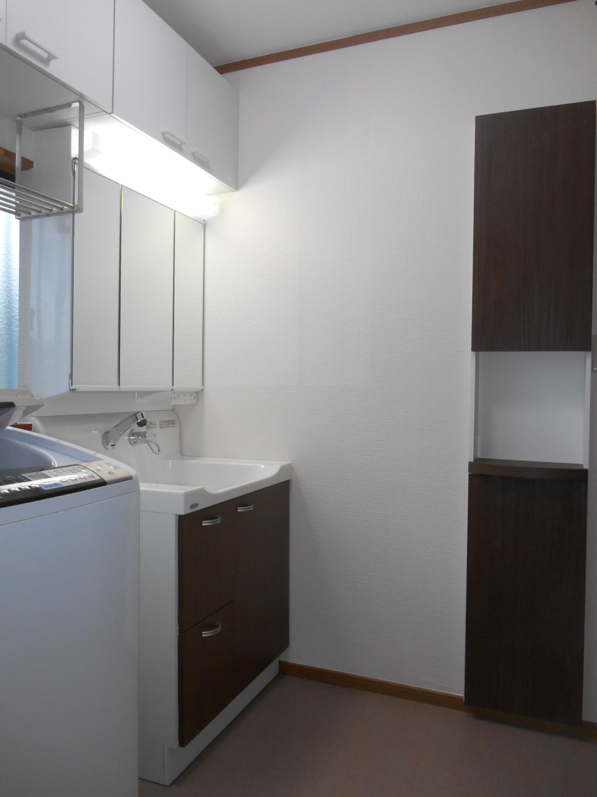 また吊り戸棚、埋め込み収納を設置したので、洗面所がすっきりしますね
