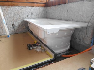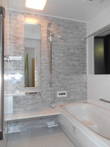 ご主人様が選んだ人工大理石の浴槽にタイル調のアクセントパネル