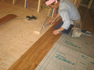 カフェ エンラージはいよいよフローリング貼りが始まりました!!