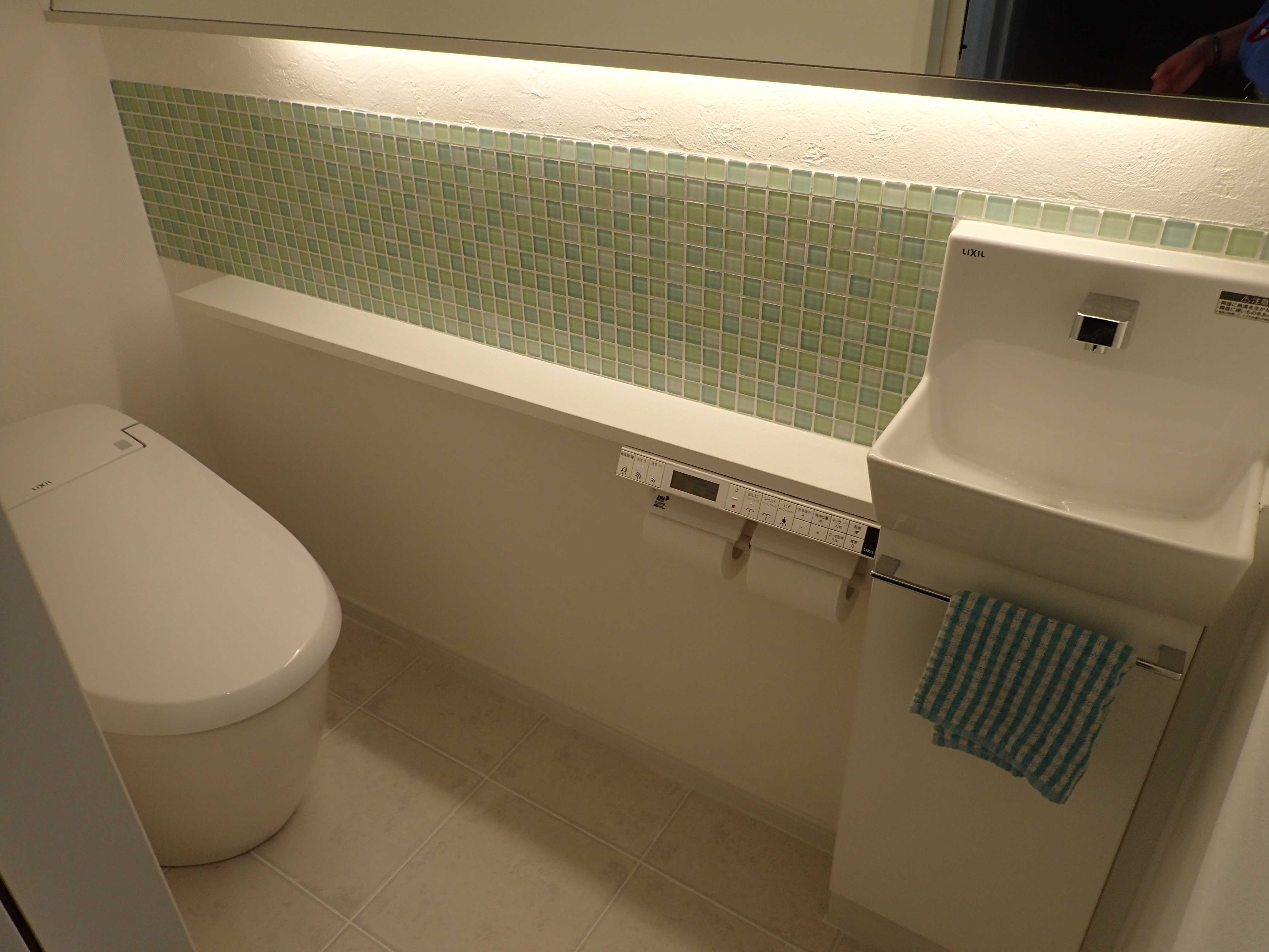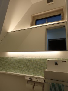 鏡の裏に照明を設置しています。光がスイス漆喰とガラスのモザイクタイルを照らしているので、