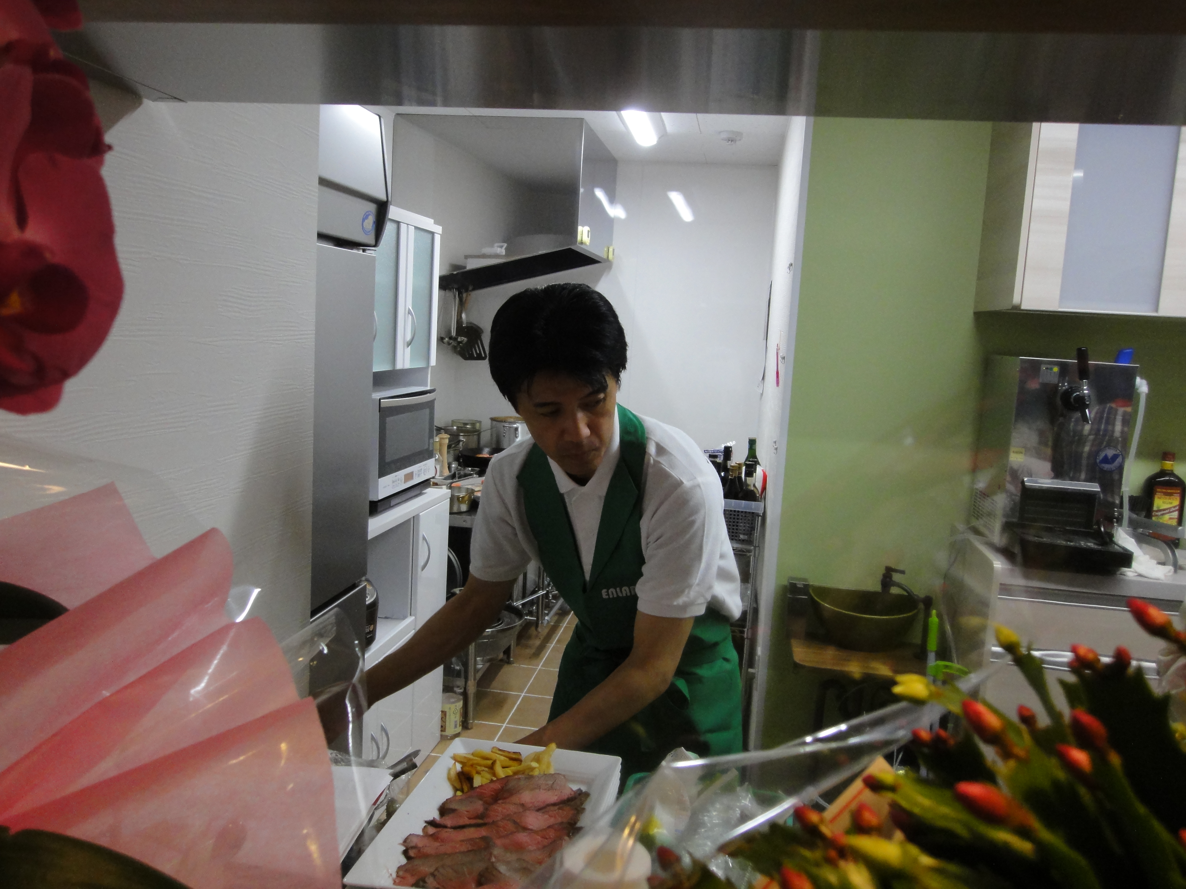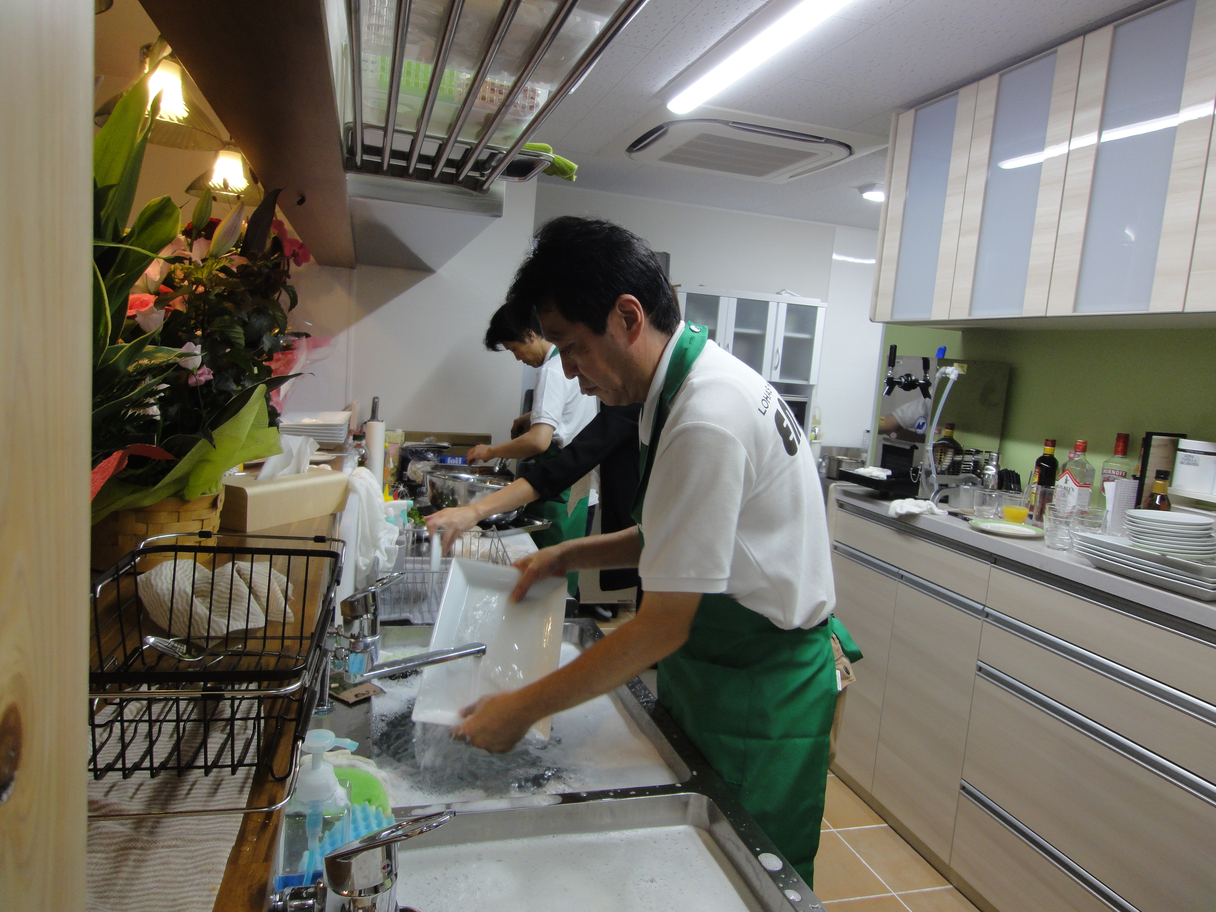 中央右が緑のエプロンの吉筋シェフです![]()