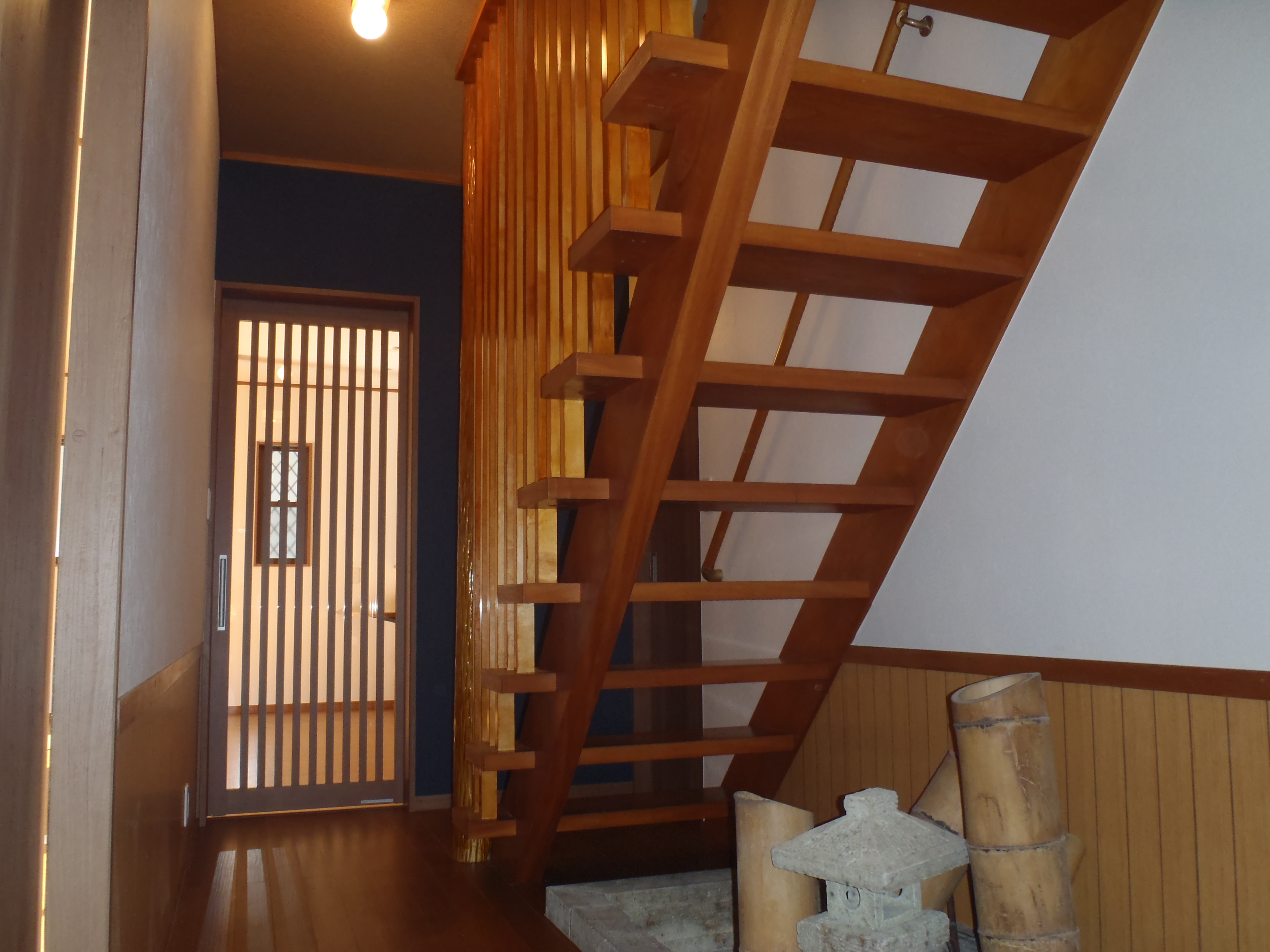紺のアクセントクロスと転落防止の手すり格子が素敵です![]()