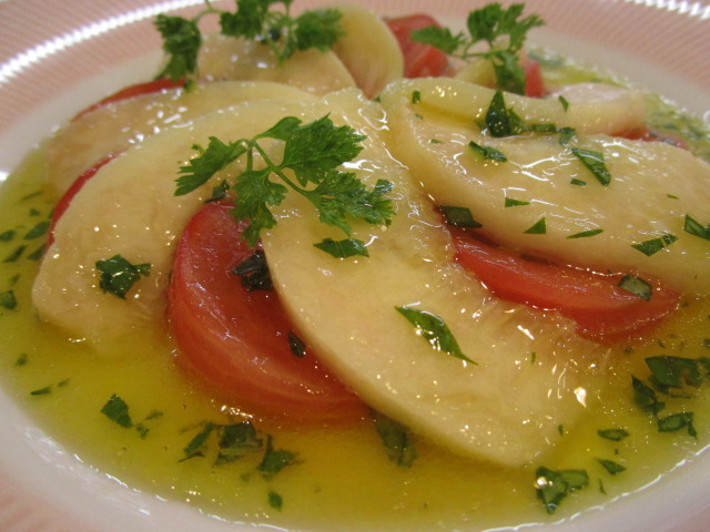 冷やしたトマトとモモをオリジナルの蜂蜜のソースで。