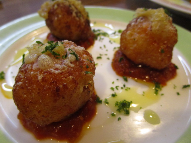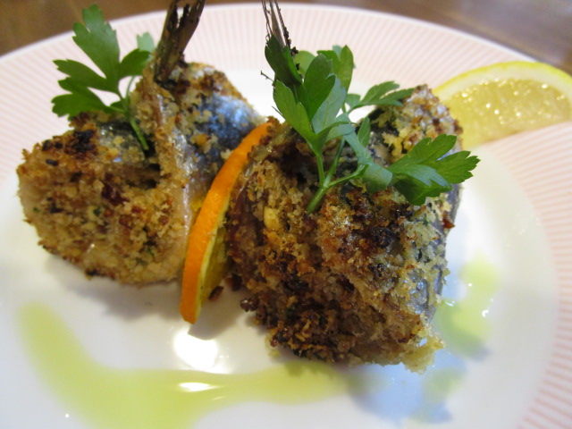いわしの中にレーズン、松の実などを混ぜ込みパン粉をくるんで