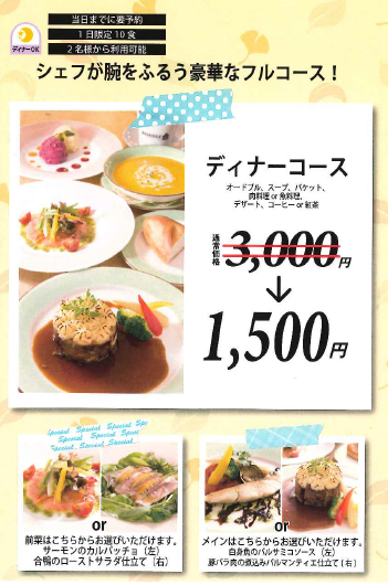 この本をご購入いただくと、通常3,000円のディナーコースが半額で食べられちゃいます![]()
