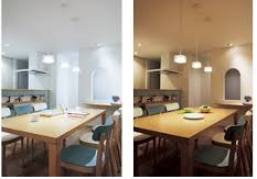1台の照明器具がリモコン1つで、白い光(蛍光色)からオレンジ色の光(電球色)へと