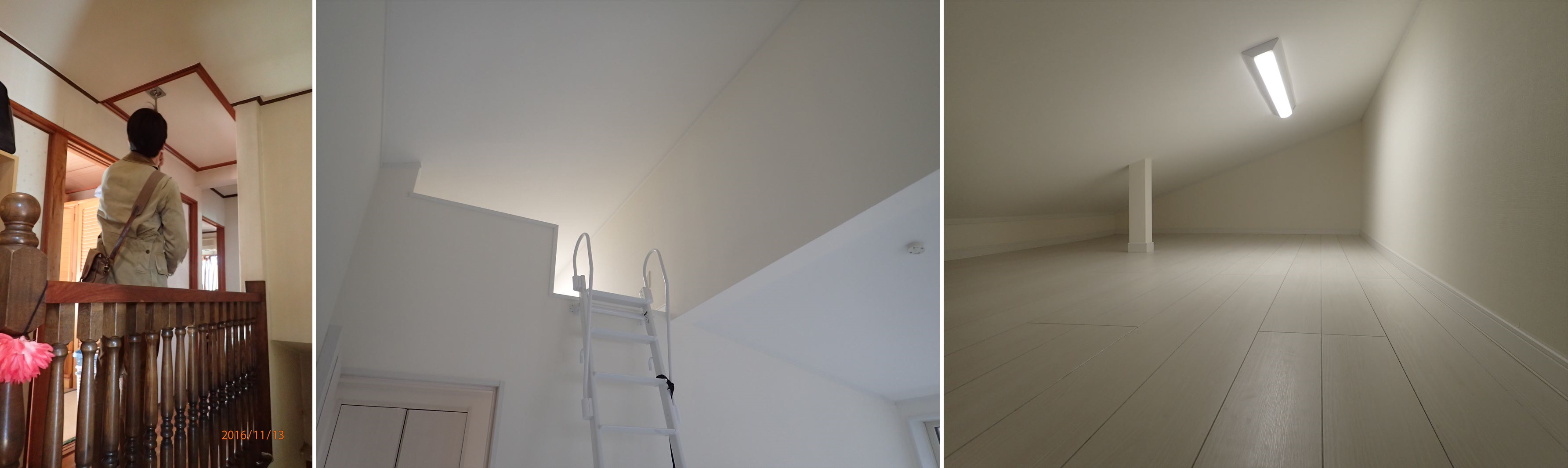 既存はハシゴユニットの小屋裏収納でしたが、部屋の天井を高くしてロフトに変更しました。
