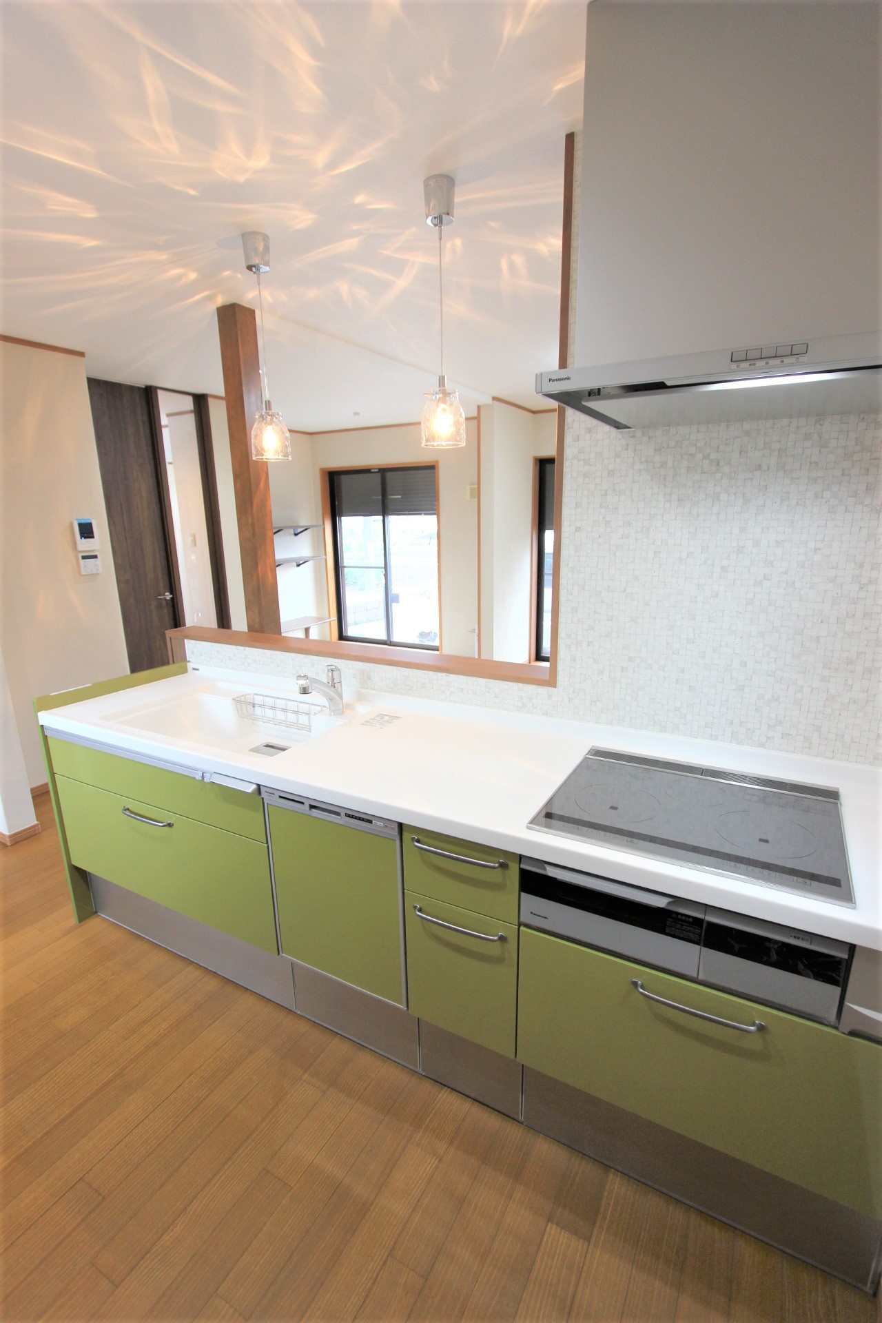お客様の選ばれたモスグリーンとモザイク調のキッチンパネルが