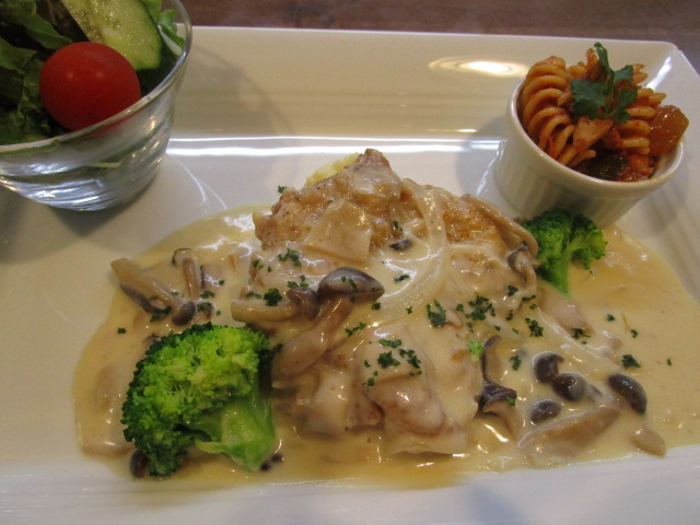 香ばしく焼き上げたチキンにキノコを加えた濃厚な