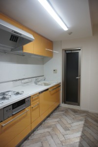 ヘリンボーン調の石目の床が、キッチンの色合いと素敵にマッチしていますね![]()