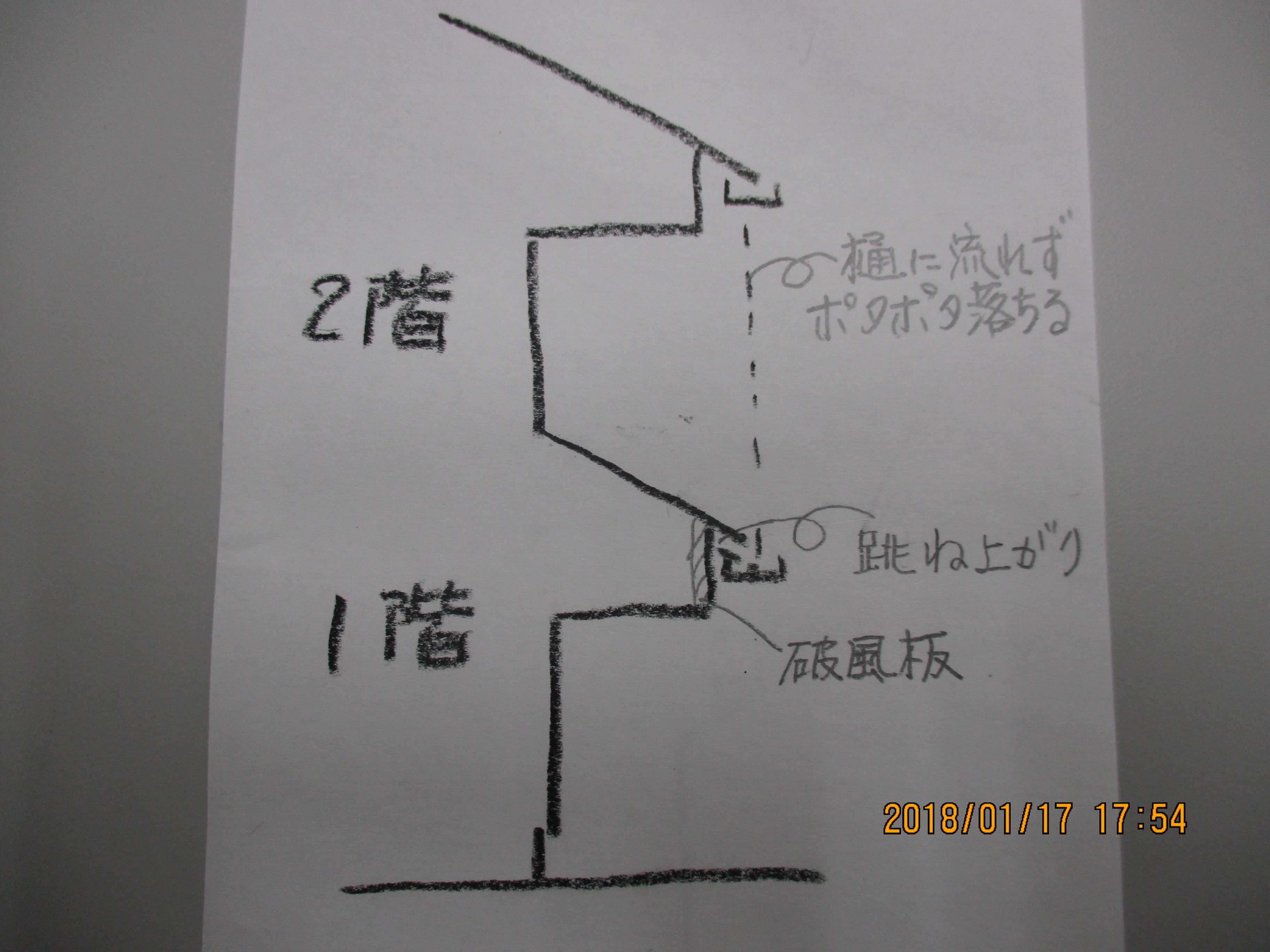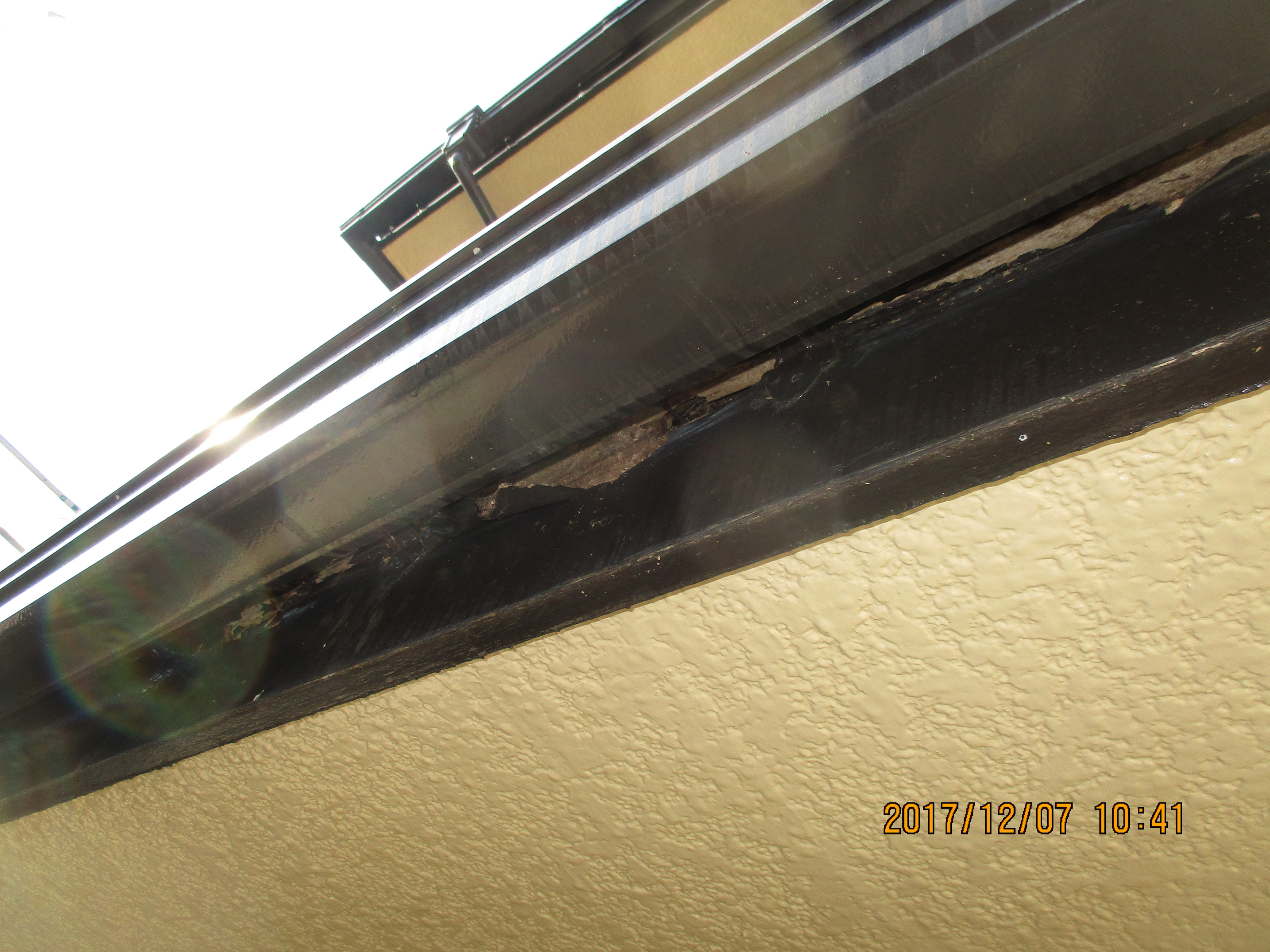 2階の樋から雨水が落ち破風・広小舞に跳ね上がり濡れたことが原因でした。