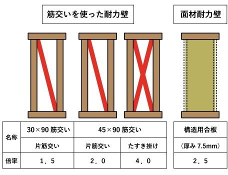 上からの重さには柱と梁で、横からの力には斜めの筋交いで抵抗する工法。