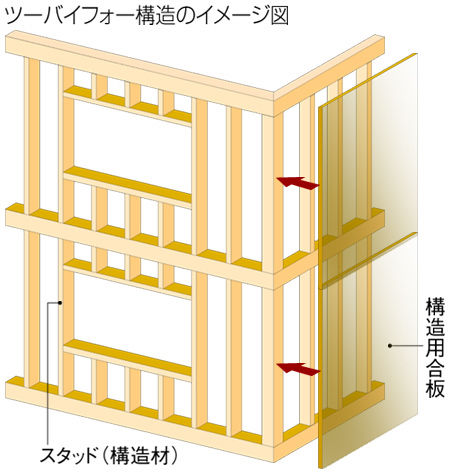 「 枠組み壁工法 」、「ツーバイ」などとも呼ばれます。