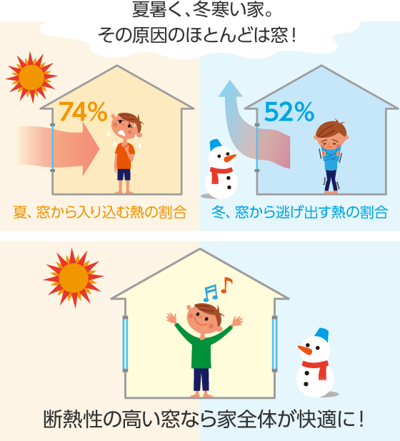 熱を伝えにくい窓は、夏は外気からの熱の侵入を抑制し、冬は室内の暖房のぬくもりを逃がしにくくなります。