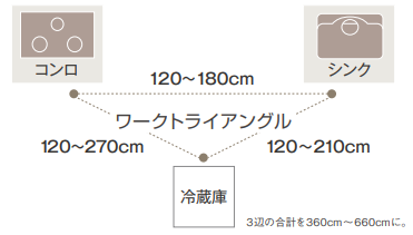 立ち位置の基本となるシンク、コンロ、冷蔵庫の3点を結ぶ動線を