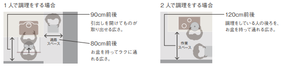 引出しを開けた時のスペースや、キッチンに立つ人の人数も考えて、