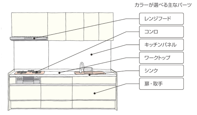キッチンは扉以外にもカラーを選べるパーツがあることを、
