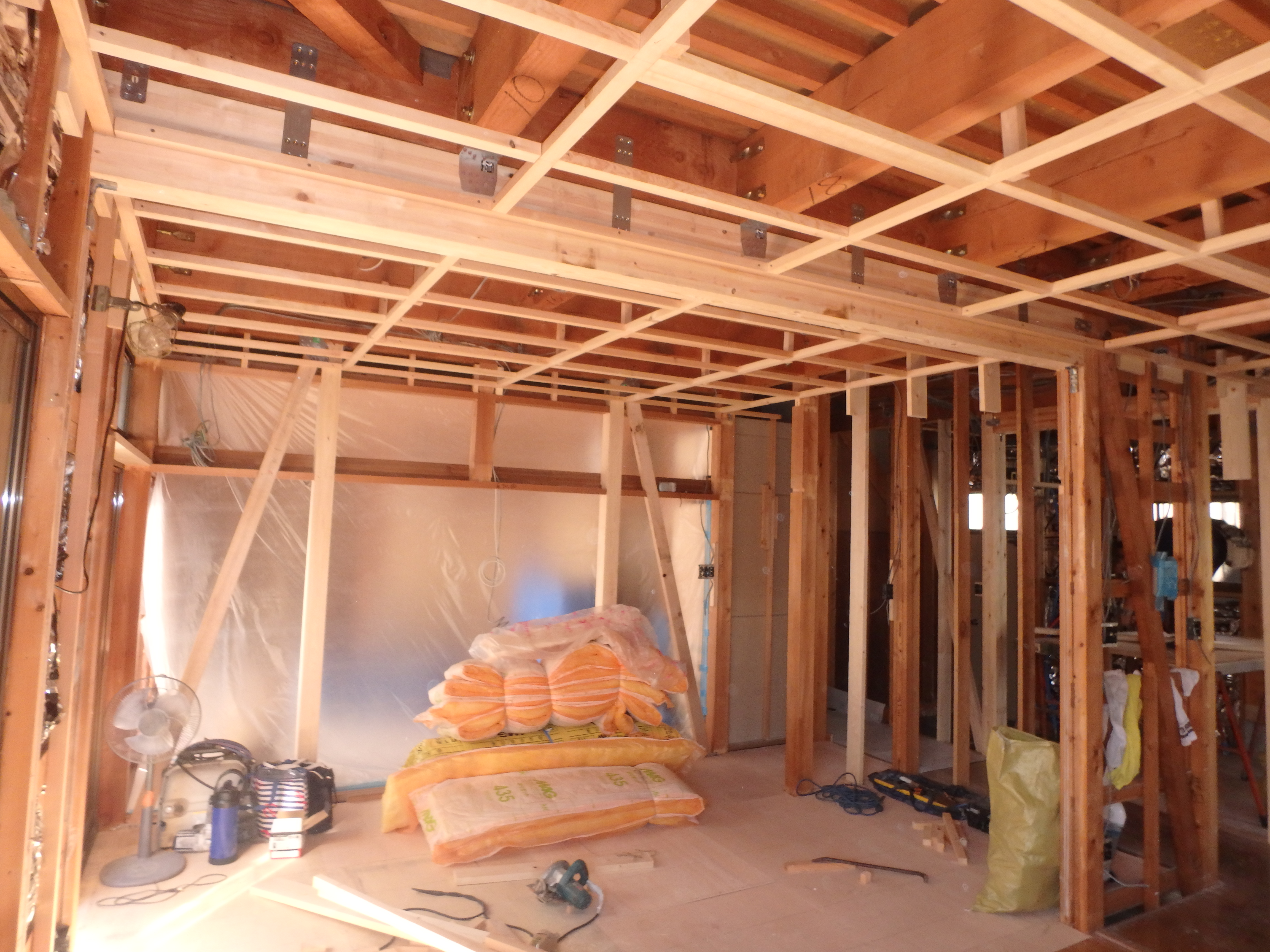 まずは壁と天井を解体して、真ん中の和室とリビングの開口を広げる工事です。