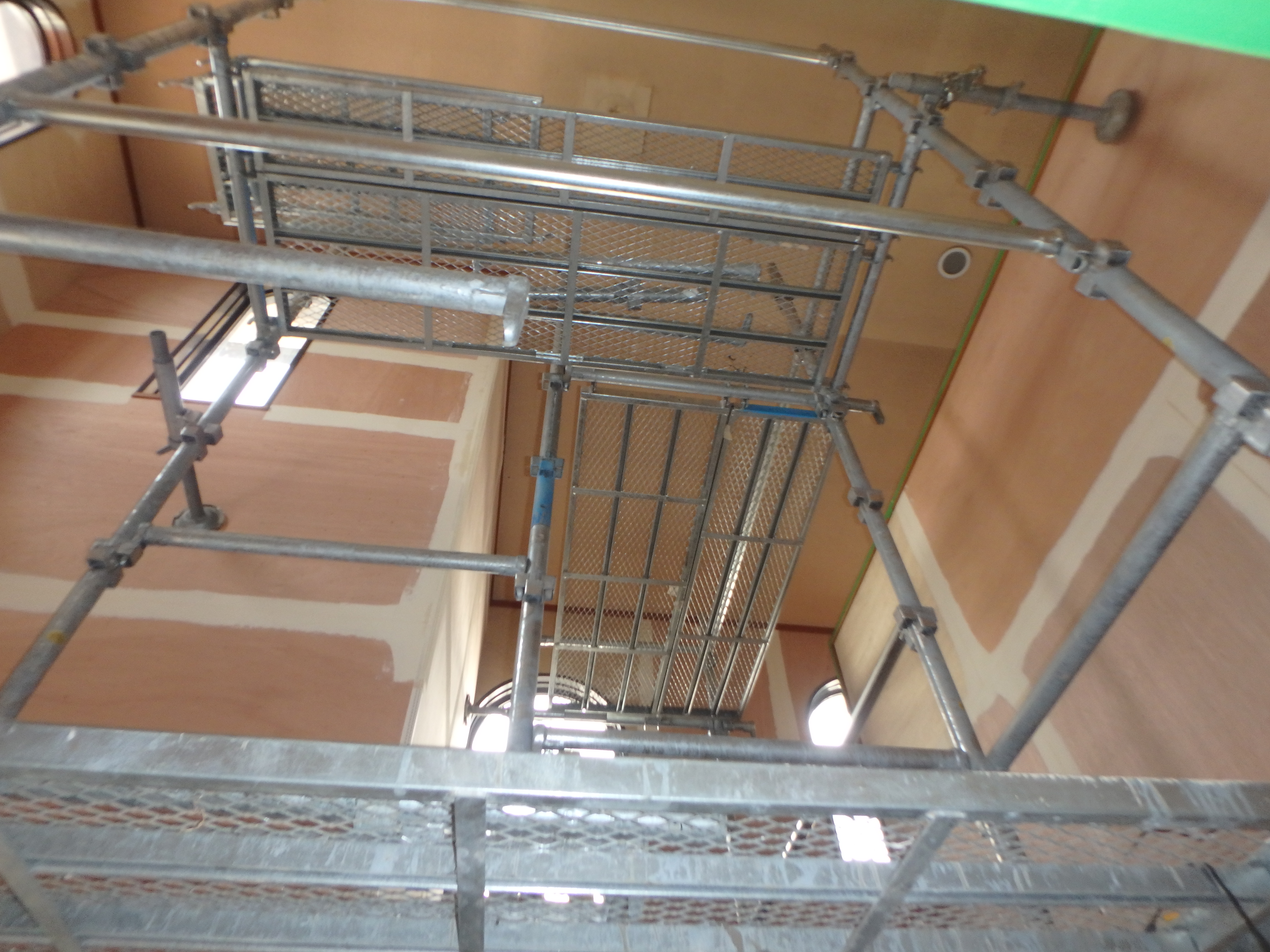 大きな吹き抜けは室内足場を掛けて内装工事に入ります。