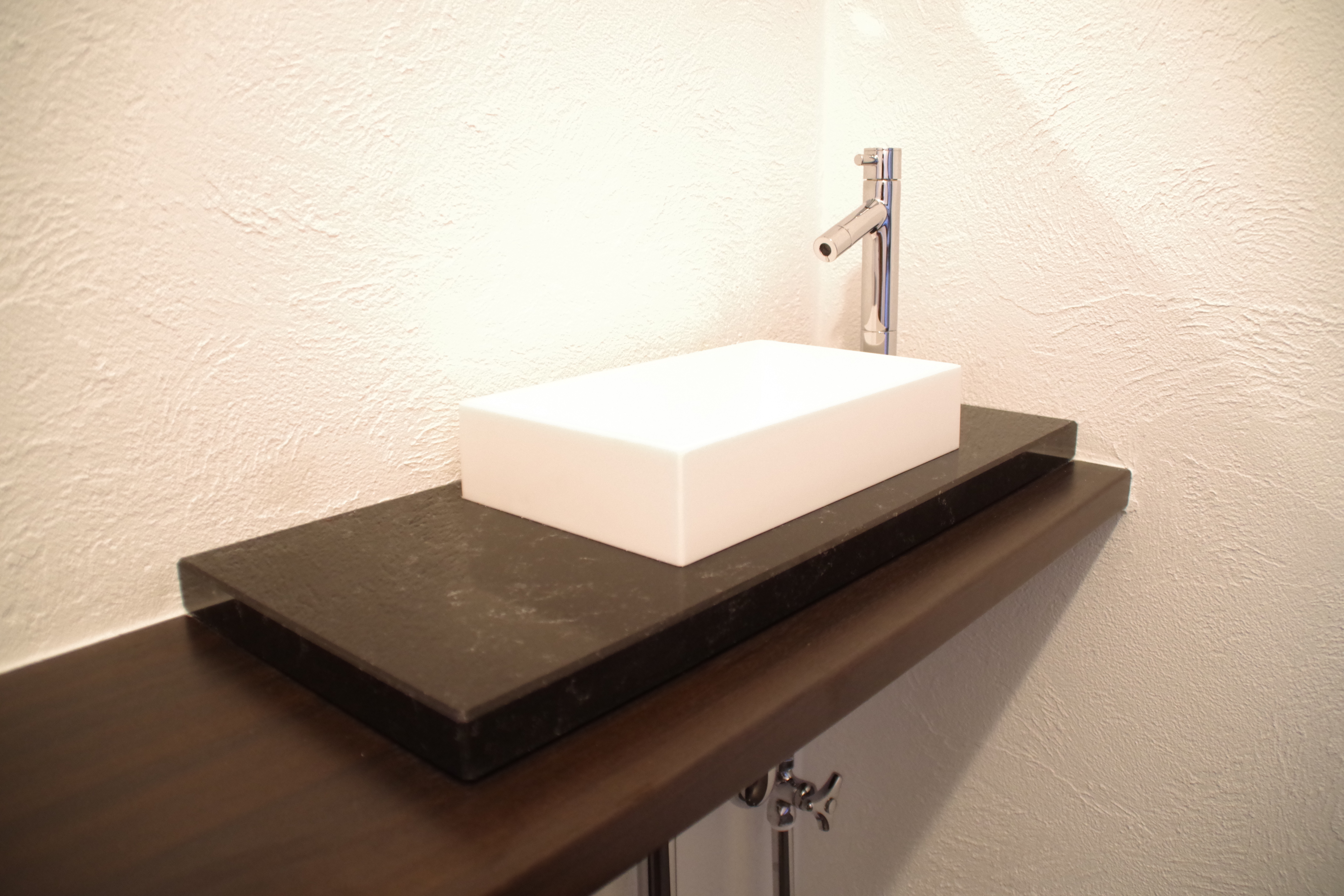 天井・壁は漆喰仕上げを計画し、洗面台と収納は完全オリジナルこだわりのデザインです