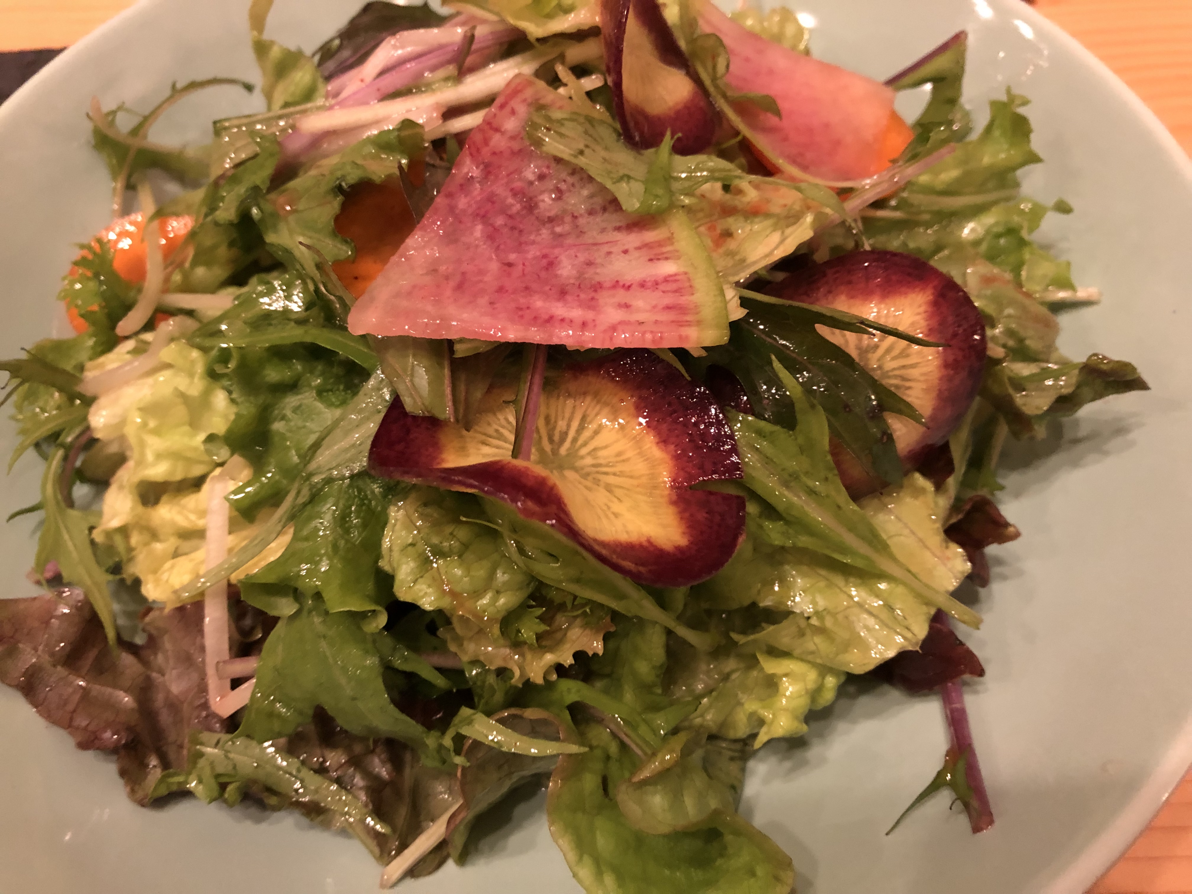 黒皮の大根や赤い大根等珍しい野菜の付け合わせ