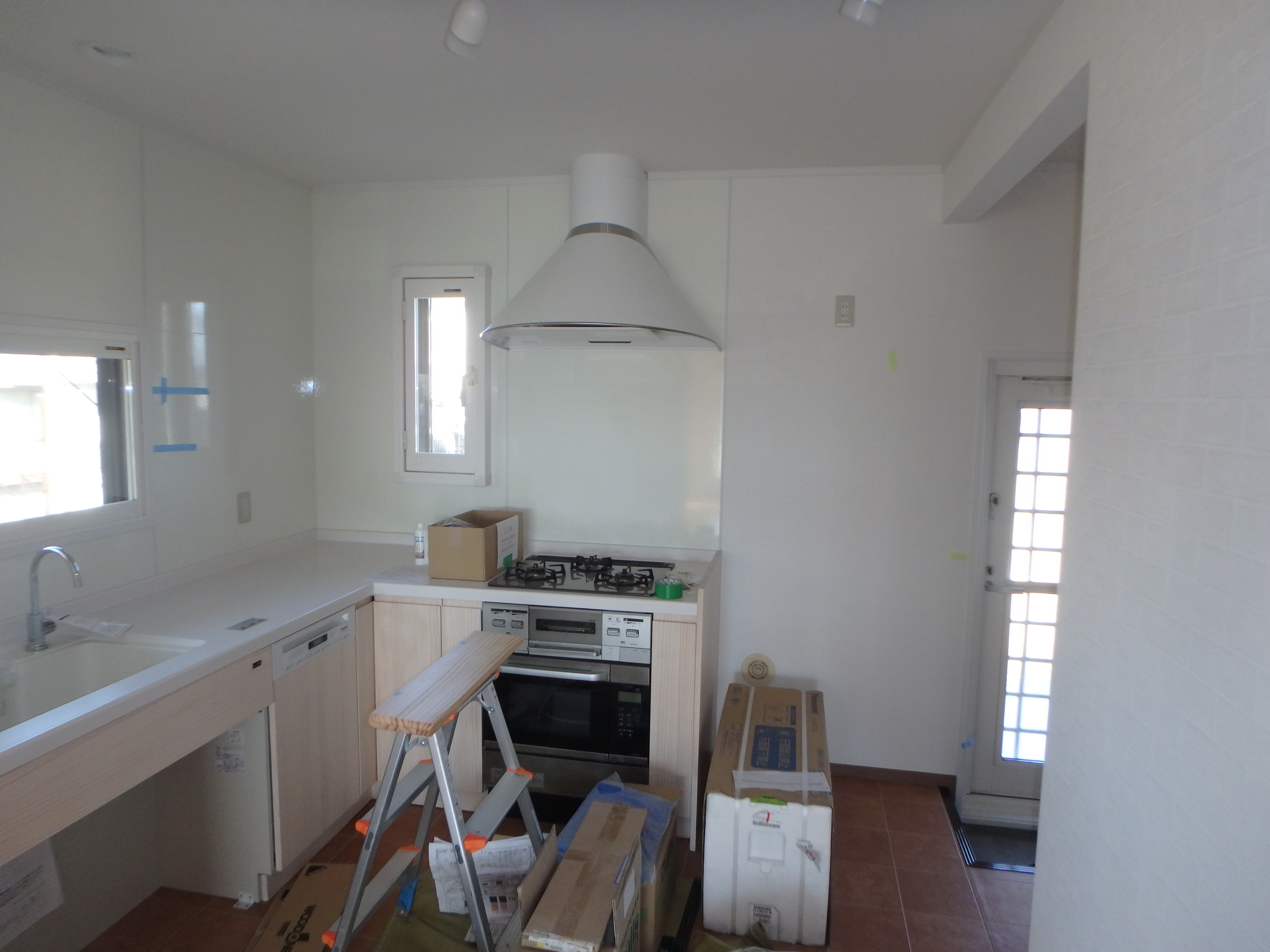 2階へのキッチン搬入はとても大変ですが、傷を付けないように気を付けて施工させて頂きました。