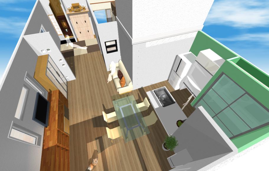 コンロ前の構造上なくせない壁を生かした耐力壁プラン