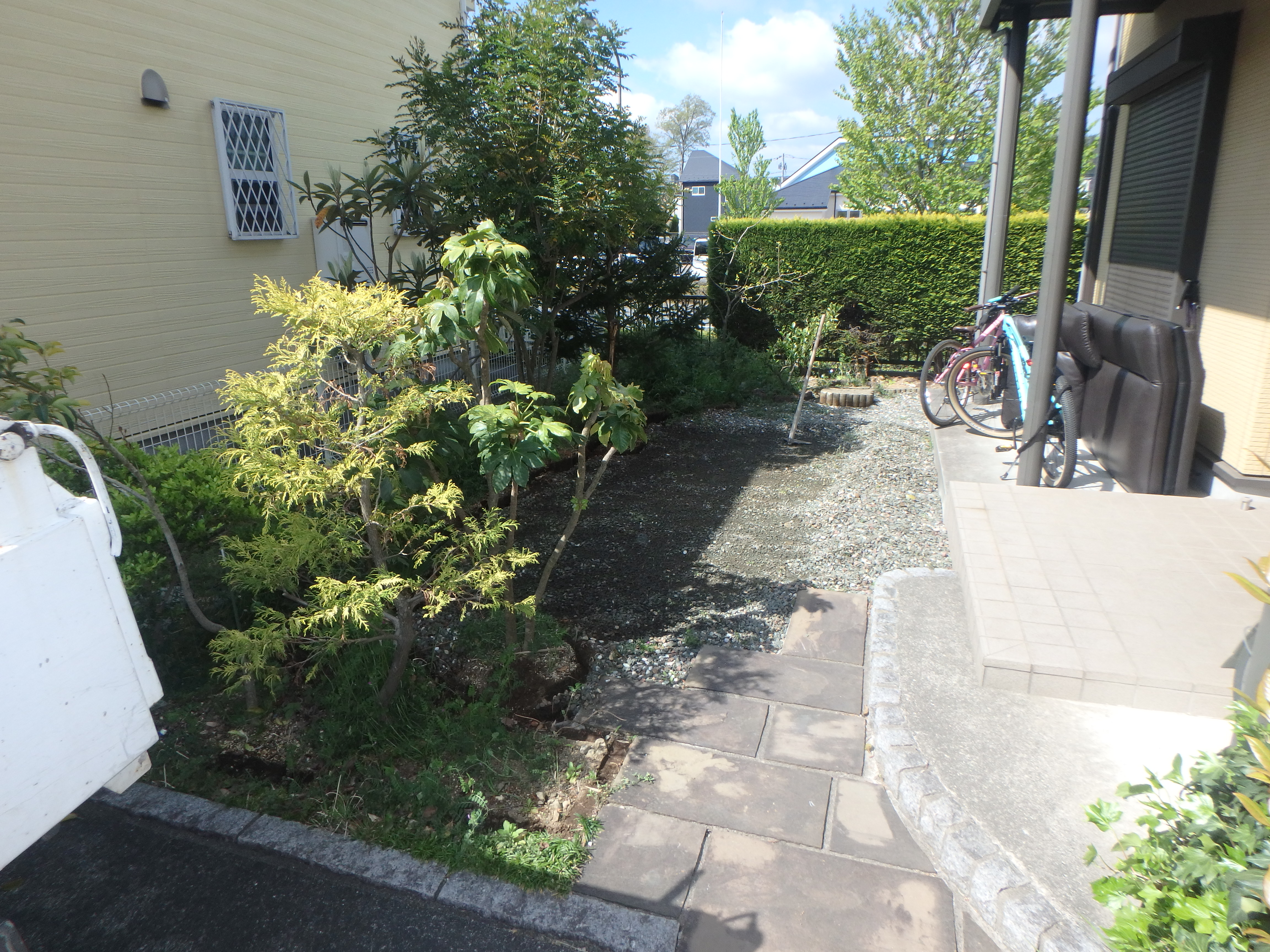 写真は施工前ですが、こちらの植木を撤去してカースペースを広げる工事です。