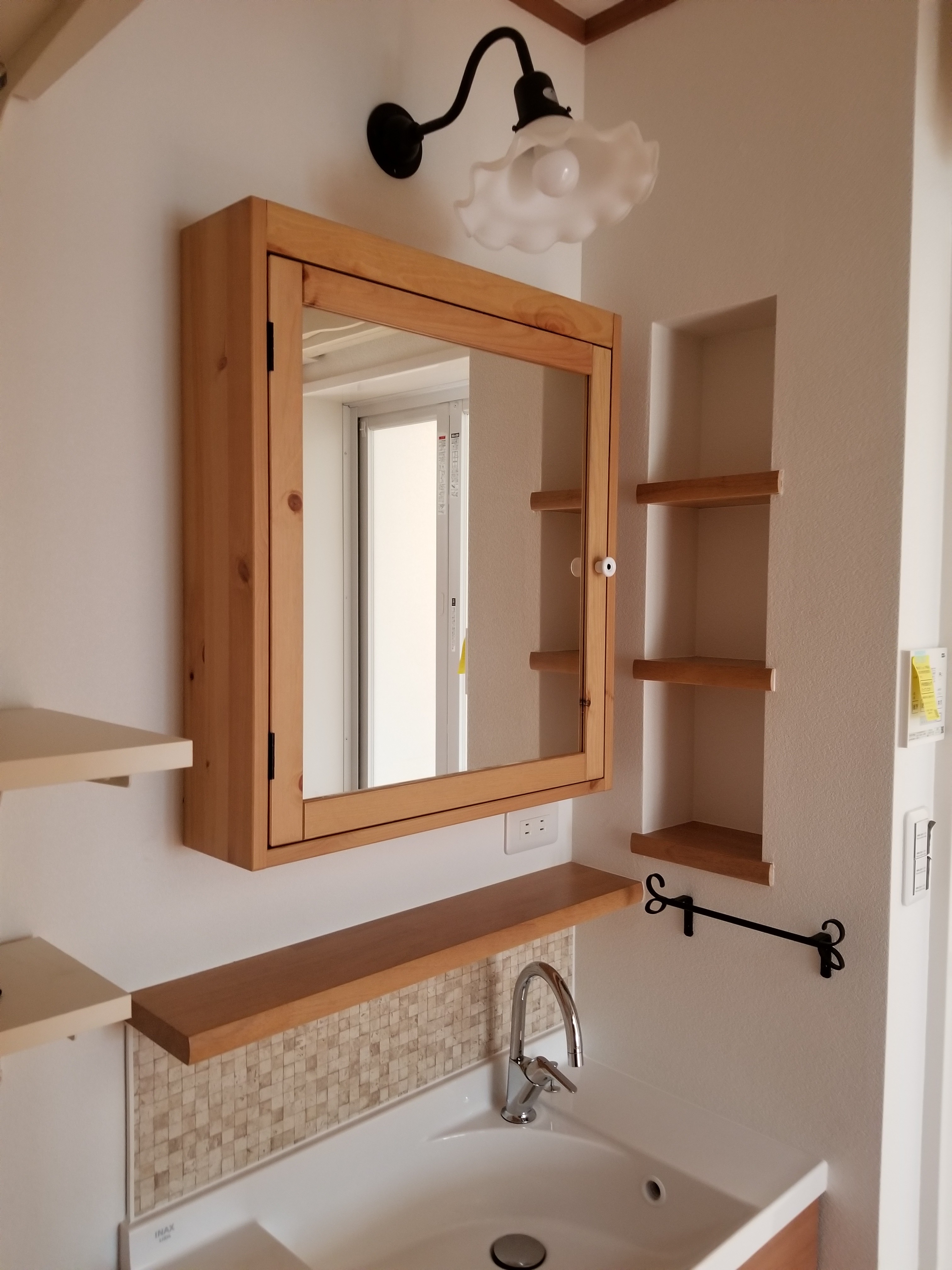 洗面台や鏡収納は、お施主様と当社プランナーがアイディアを出し合い合作しました。