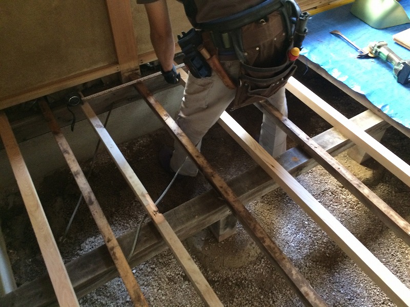 畳を上げた後、新しい根太材を入れてしっかりとした合板で床の下地を作り直しました。