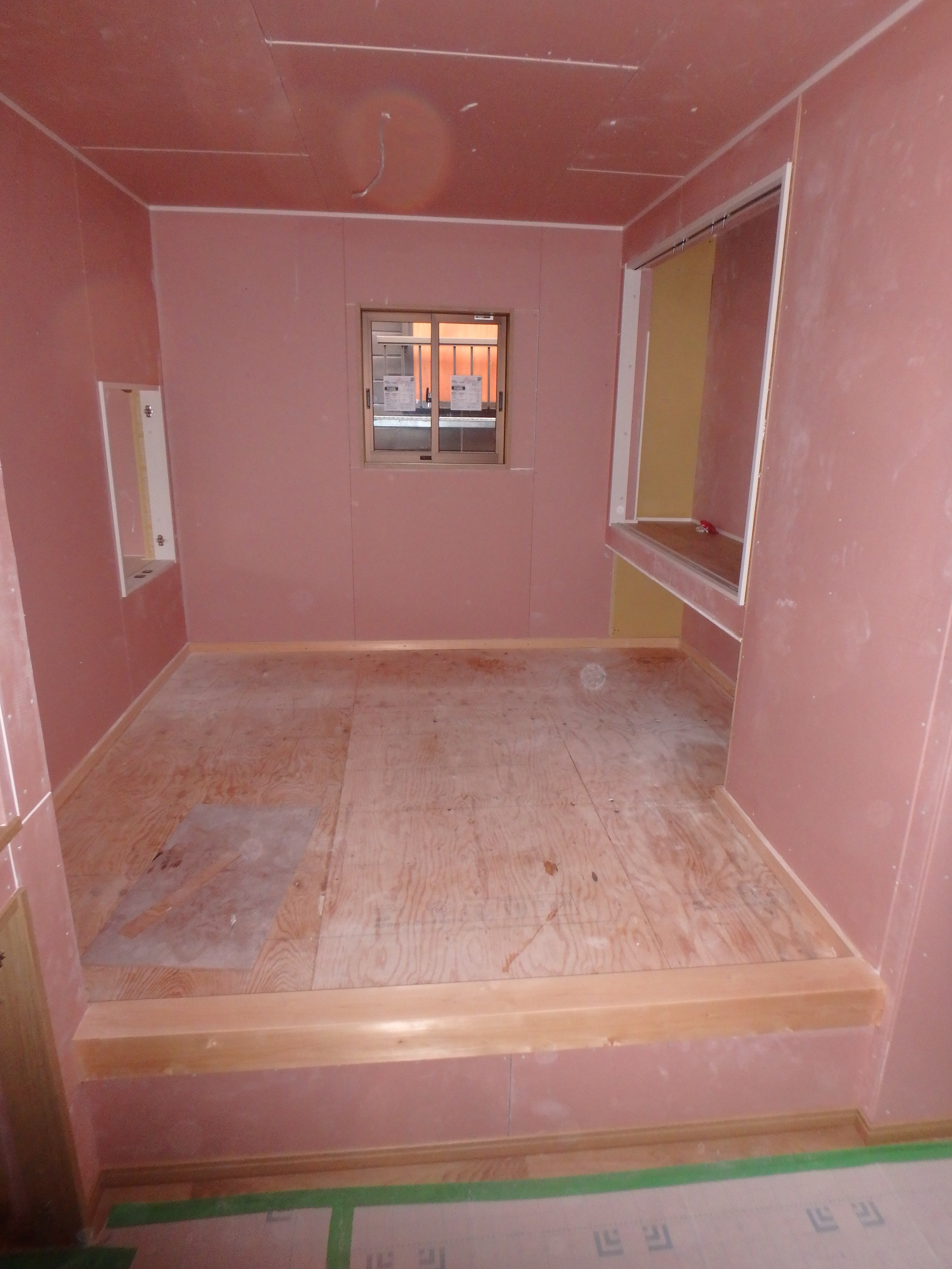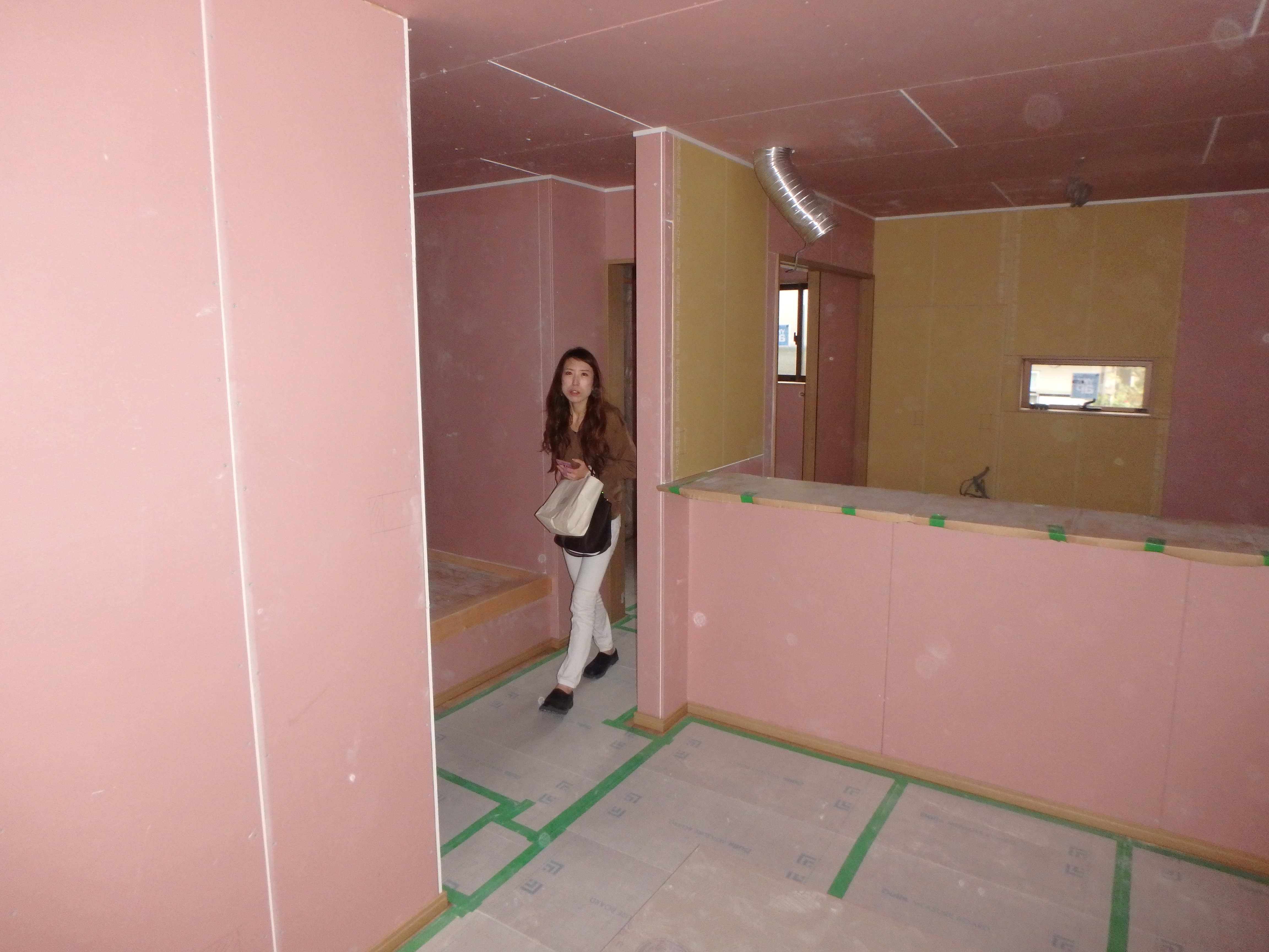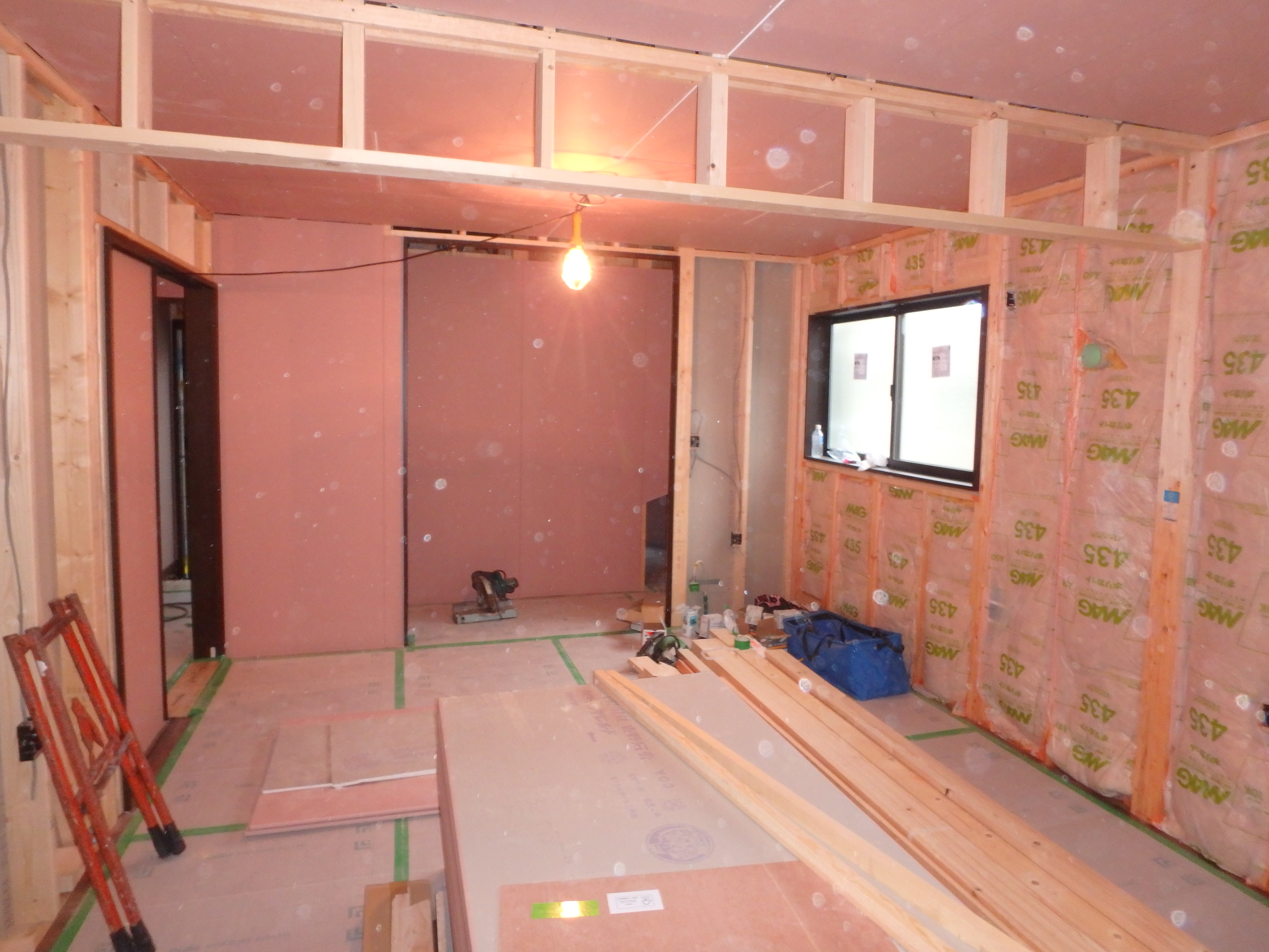 内部は大工さんの工事が順調に進み、壁と天井のボードを貼っているところです。