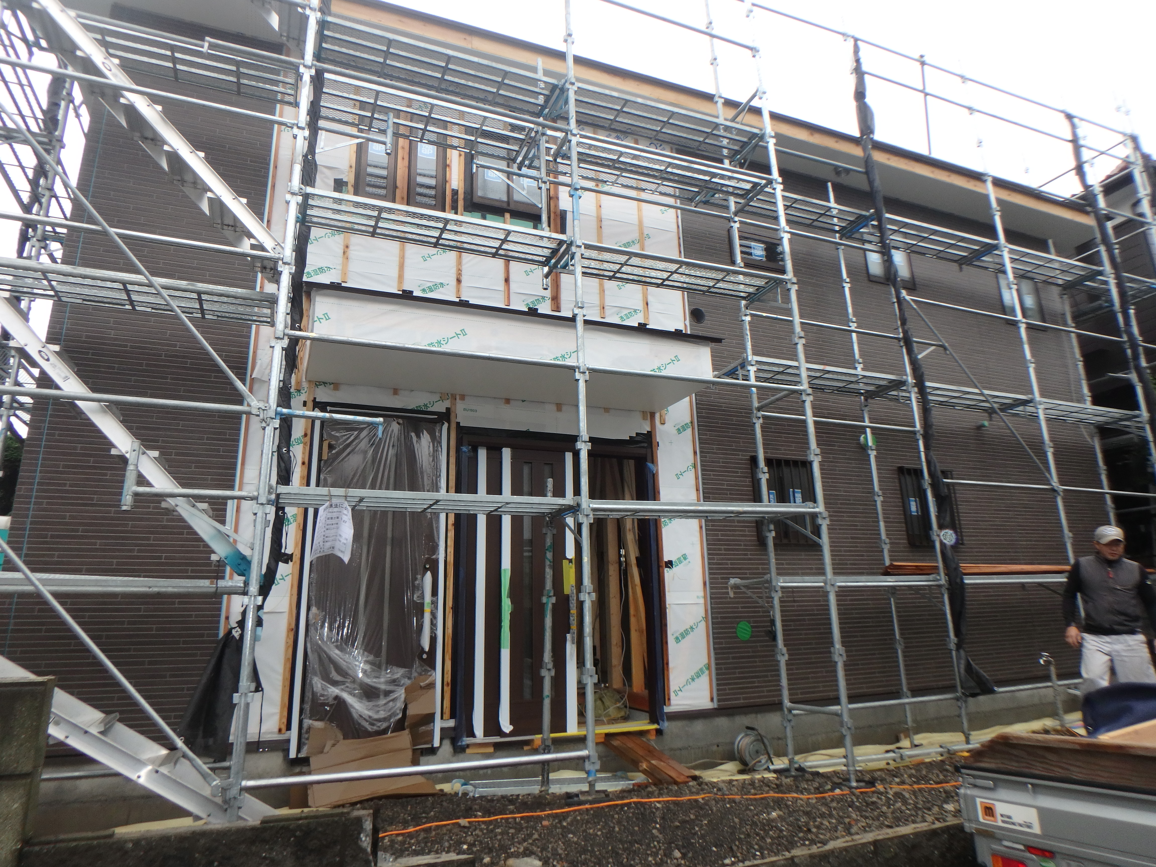 雨天でやや遅れていましたが、もうすぐ貼り終わり足場の解体となります。