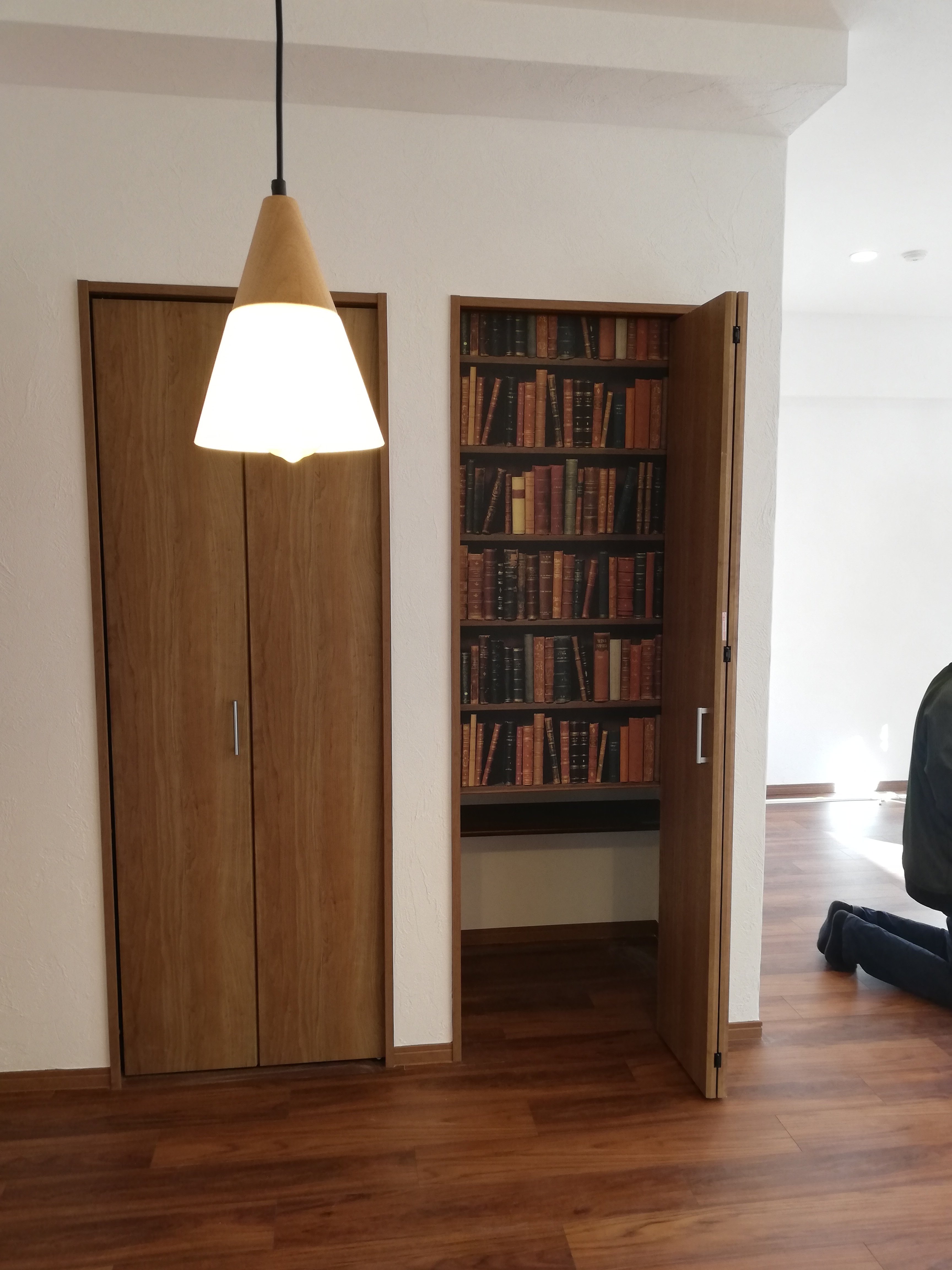 仏壇置き場の側面の壁には、本棚風のクロスをご提案させていただきました