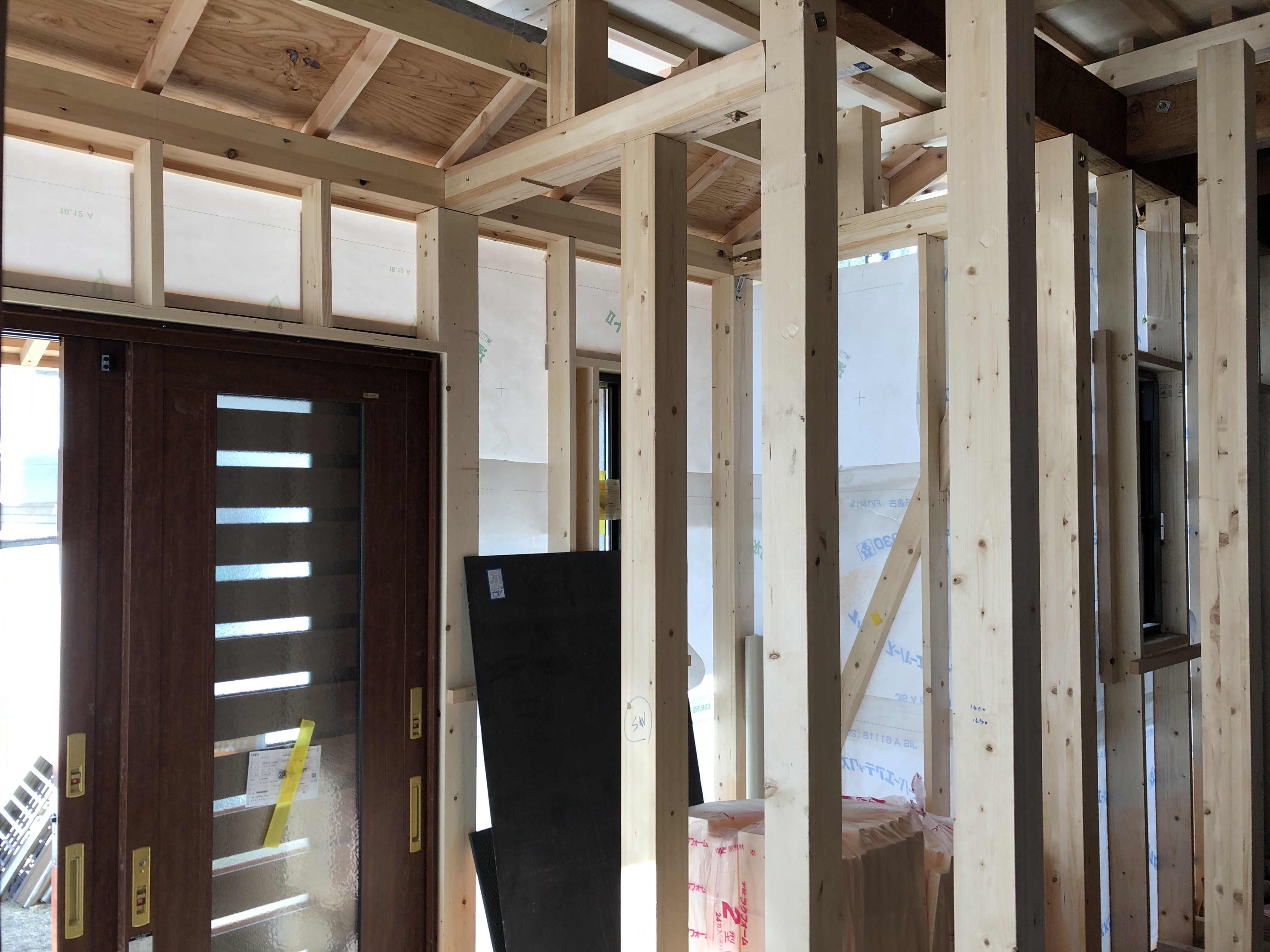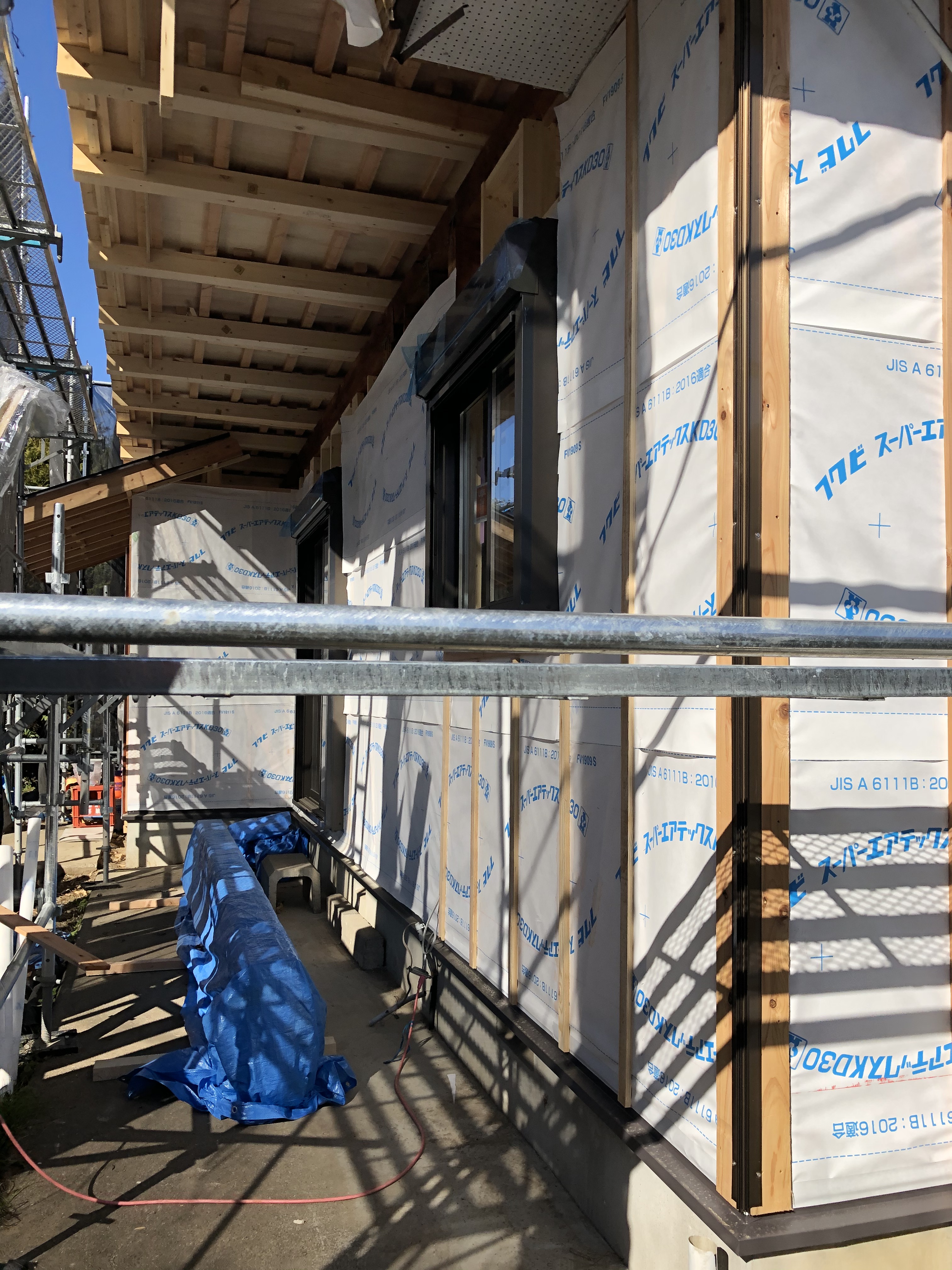 透湿・防水シートを貼り、胴縁という木の下地まで終わったので