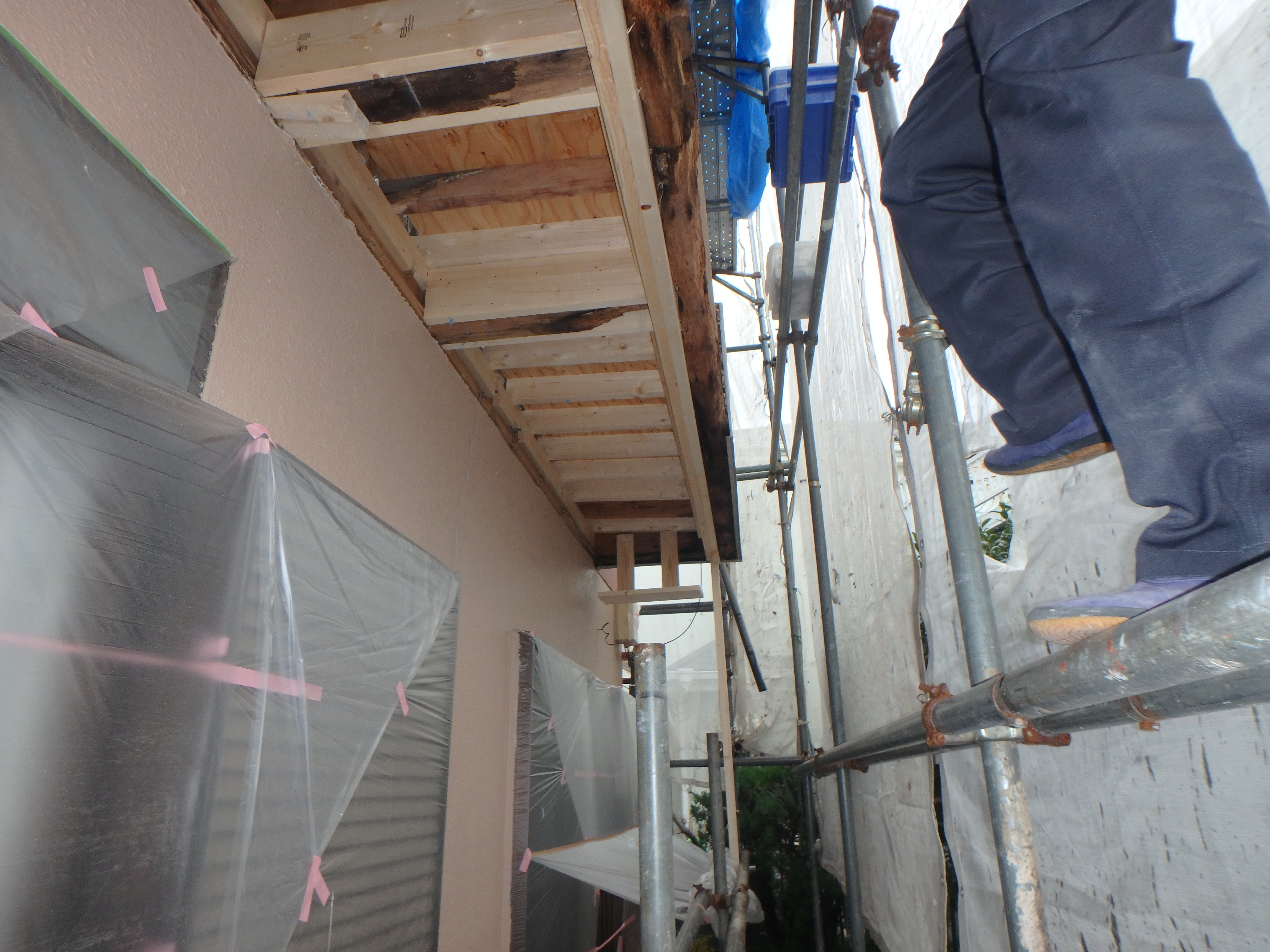 跳ね出しの梁は建物の内部から伸ばしているので、交換する事はできません。