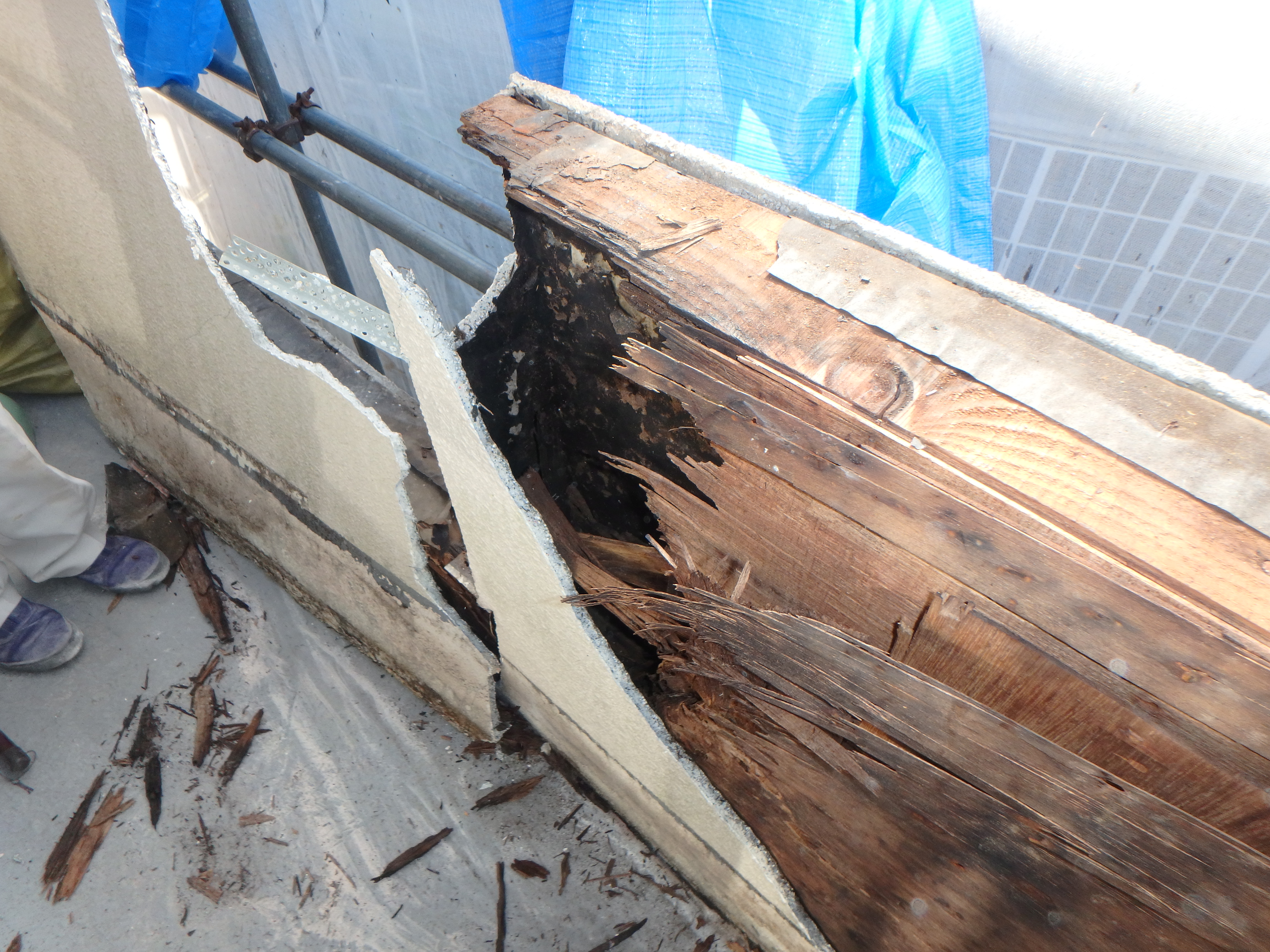 手摺り壁を壊して見ると笠木から雨水が進入し、だいぶ腐食が進んでいました。