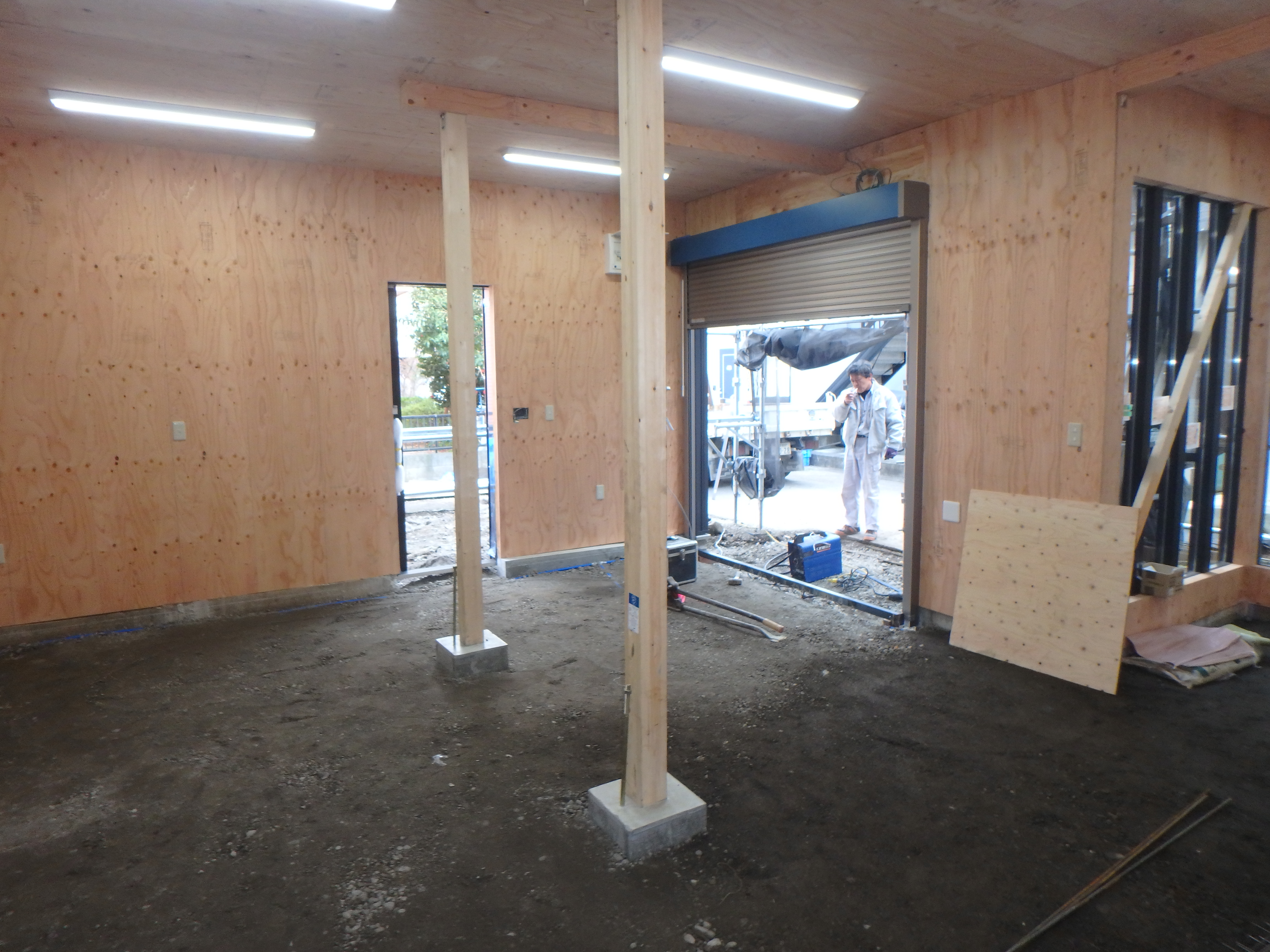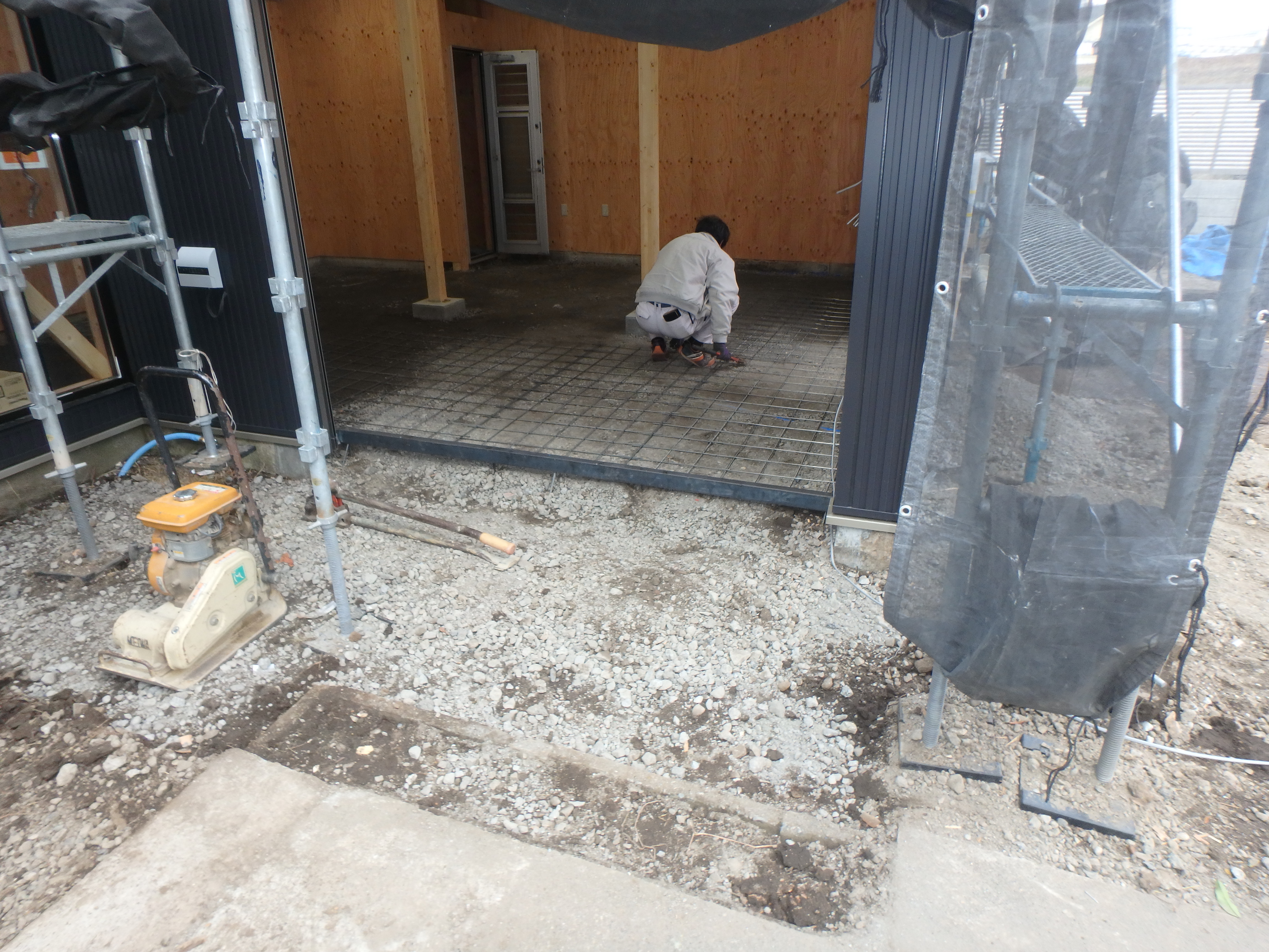 床にメッシュ筋を入れて、これから土間コンクリートを打ちます。