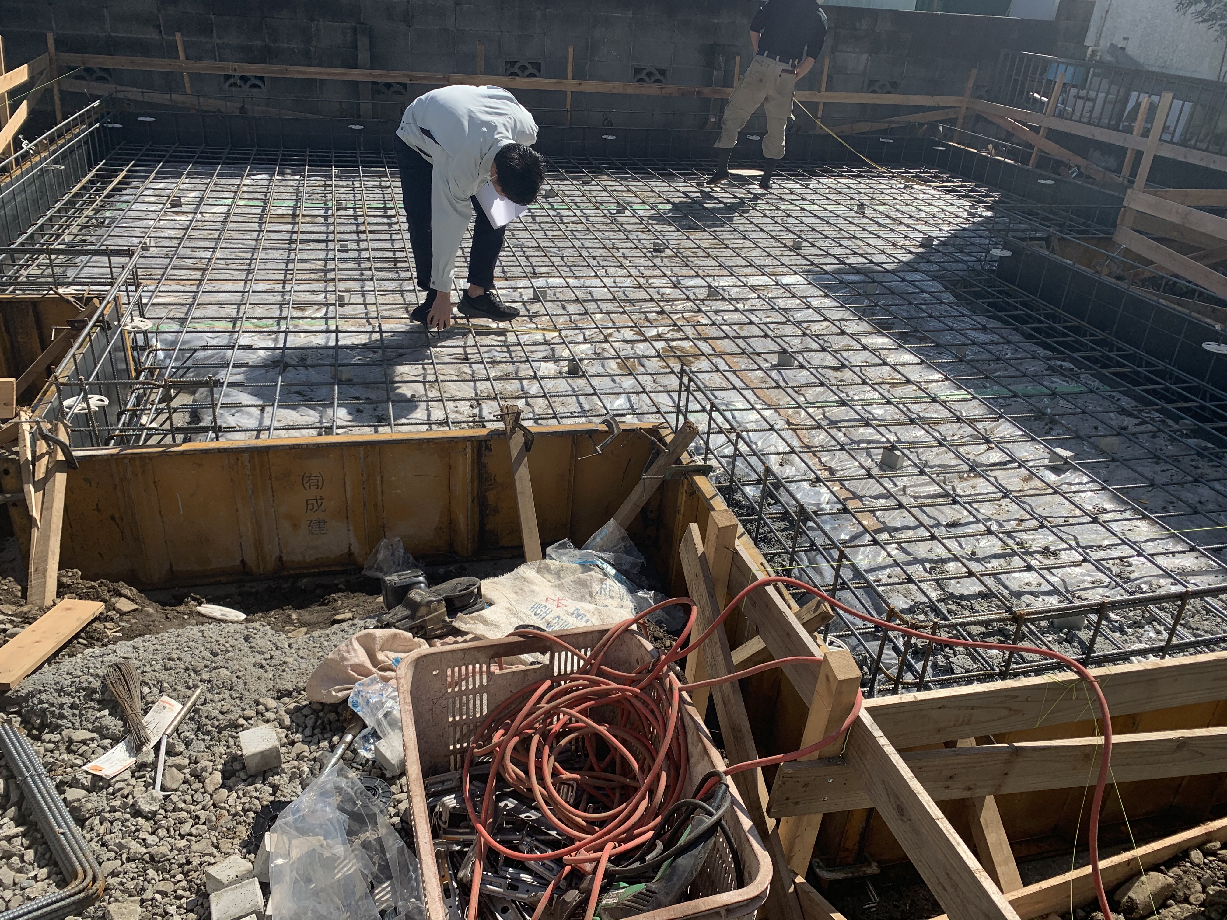 ベタ基礎の床(耐圧盤)の鉄筋は、密に20cm間隔で入れています。