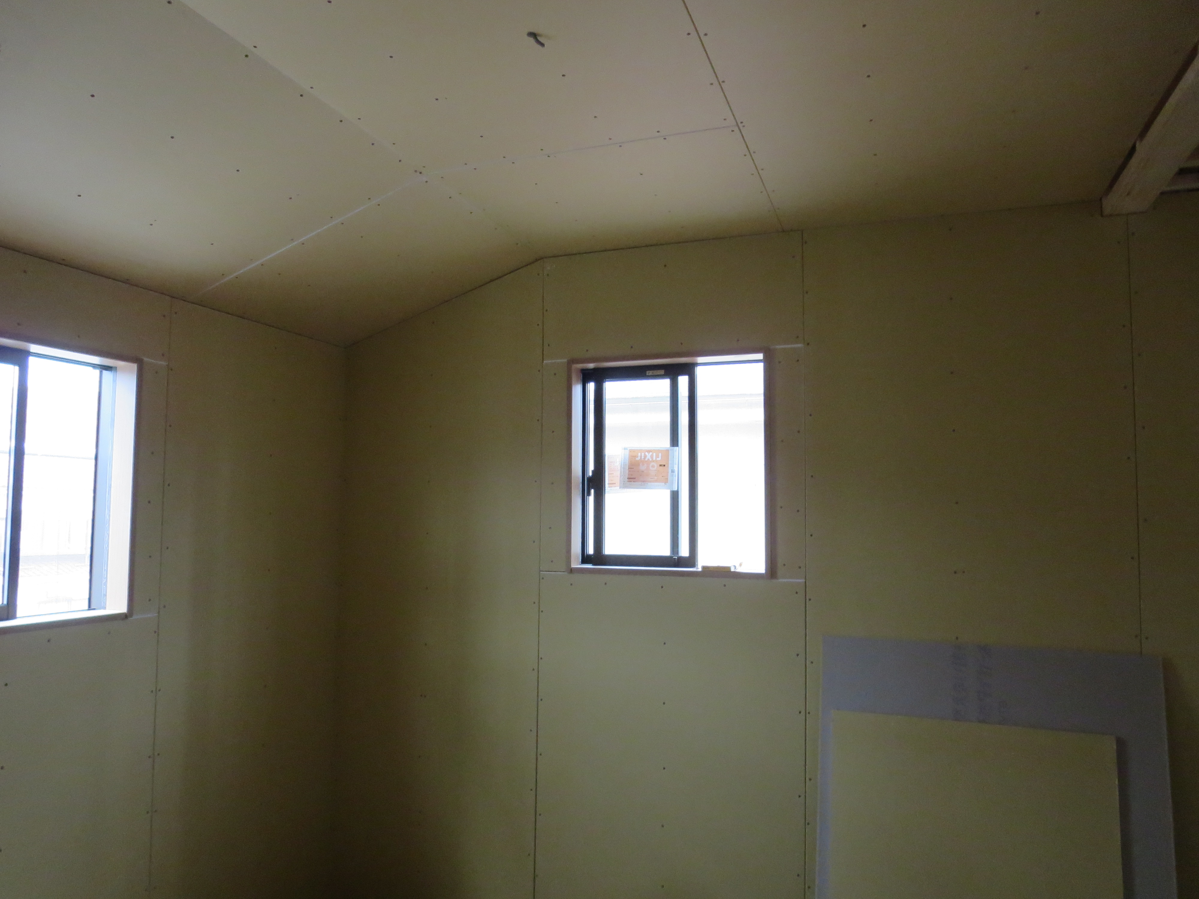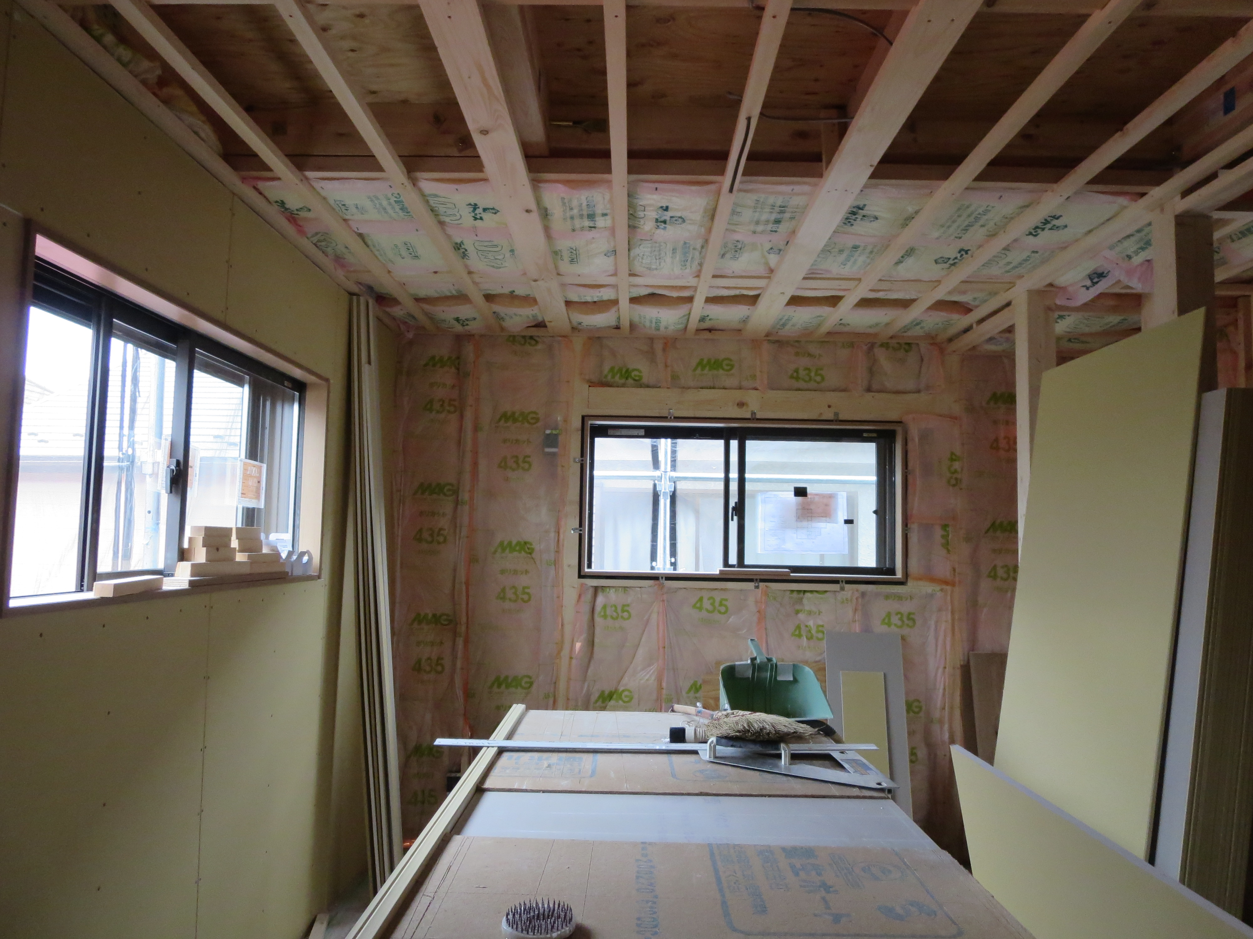 床はフローリングが貼り終わり、壁と天井の下地ボード貼りを行っている所です。