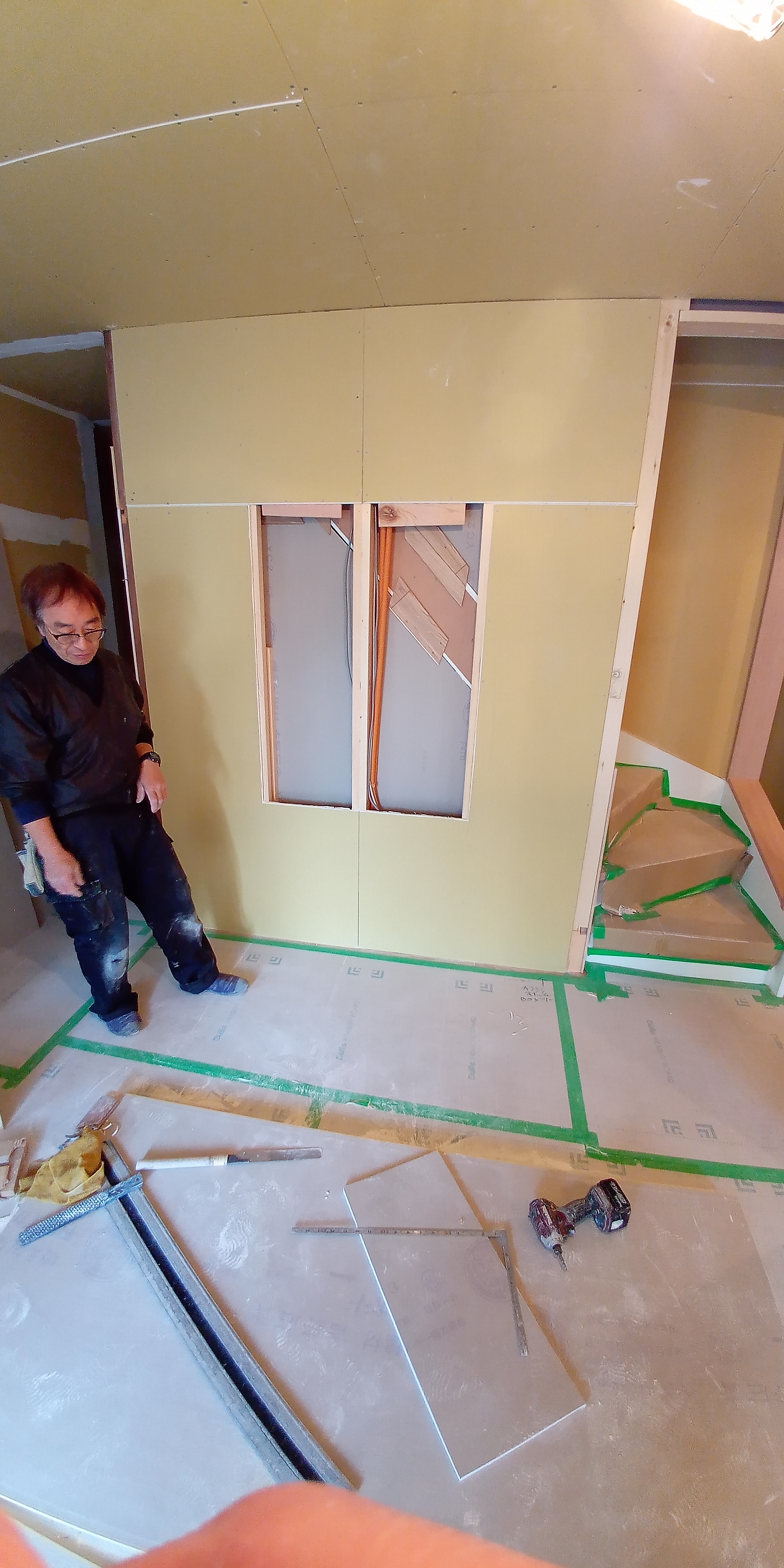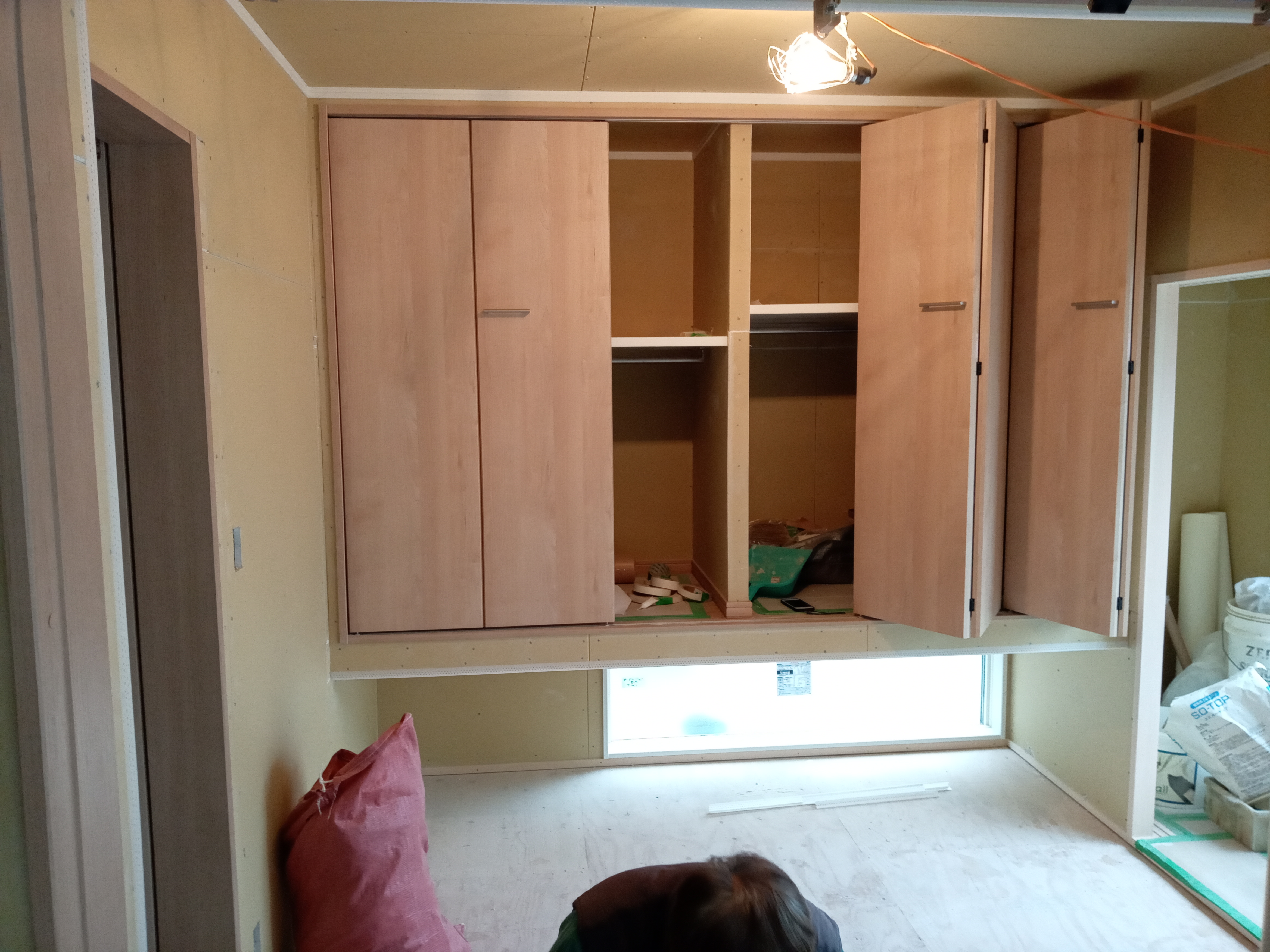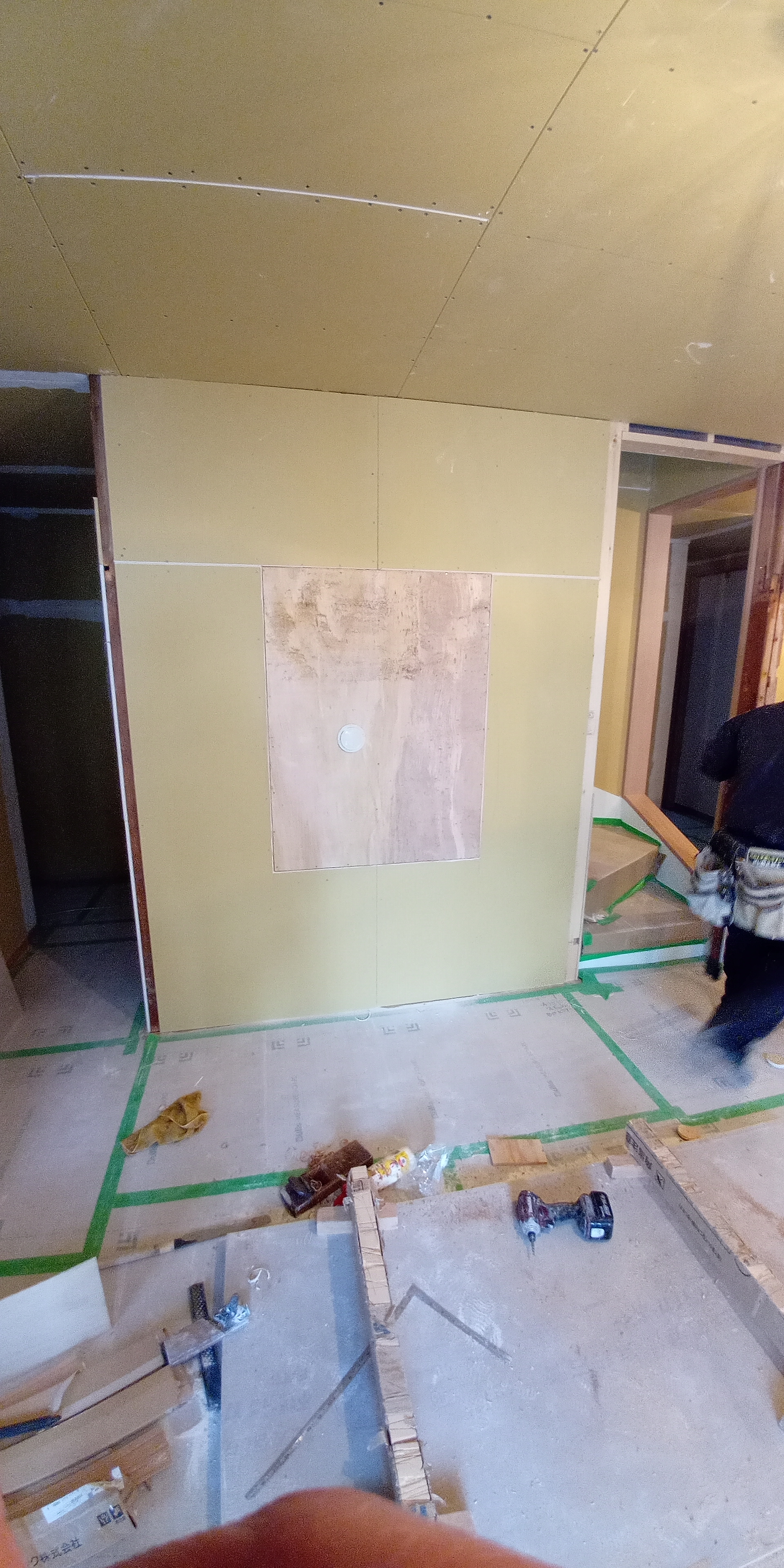 そして壁掛けテレビ用の配線をして、大工さんに合板を貼ってもらいました。