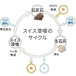 現代の漆喰は1,400℃の高温で焼成するのに対して、スイス漆喰は950℃の低温で1週間かけて焼成します。