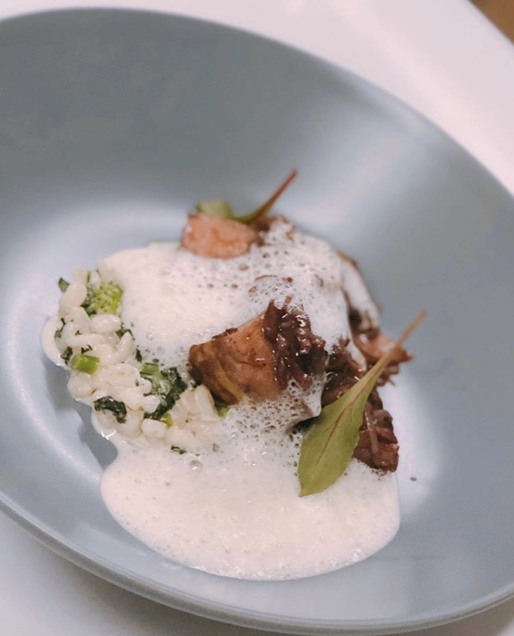 静岡県産タケノコの赤ワイン煮 麦と菜の花のリゾット 筍の泡