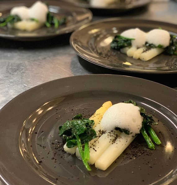 フランス産ホワイトアスパラガスと八王子市産ほうれん草〜ホワイトアスパラガスのエキュームを添えて