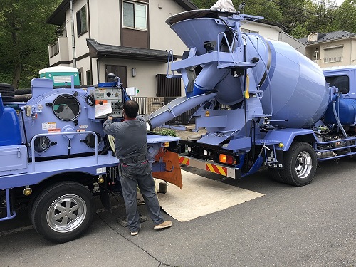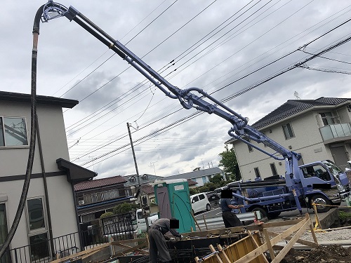 コンクリートを流す作業では、大きなポンプ車の力を借りて行います![]()