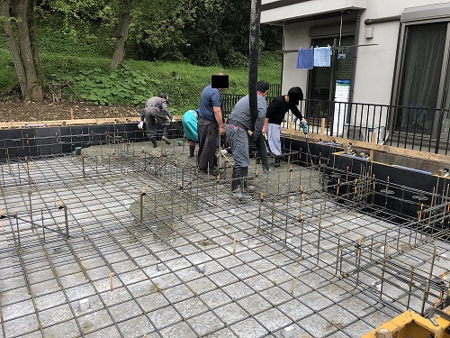 しっかりと鉄筋を組み、スリーブ管を設置した後、ベースや外周部のコンクリートを流していきます。