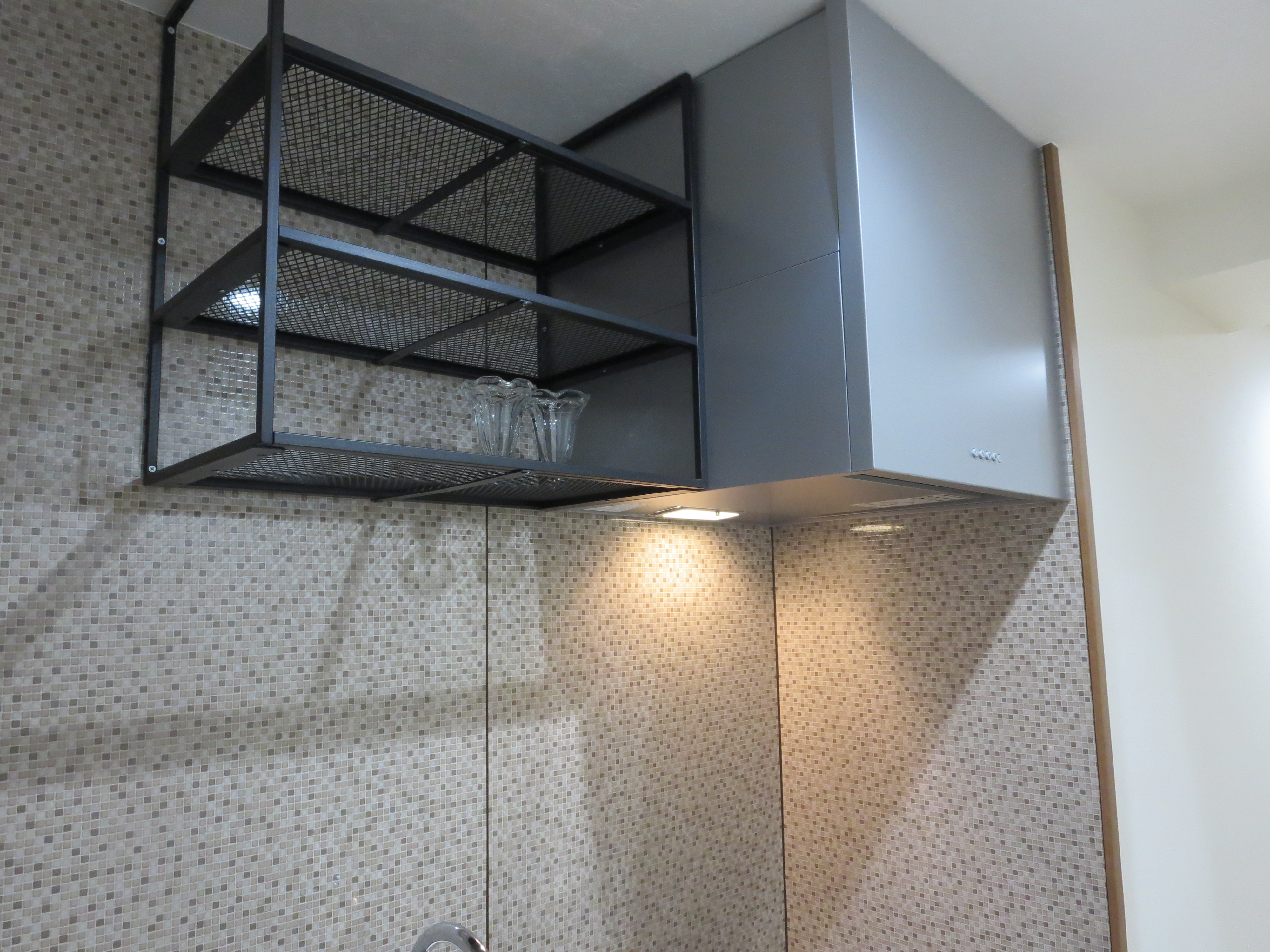 キッチン収納もアイアンフレームのオープン棚というこだわりよう![]()