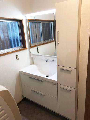 洗面台交換では、タオルの収納にお困りでしたので洗面台横に一緒にトールキャビネットを設置しました。