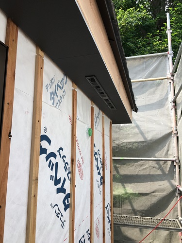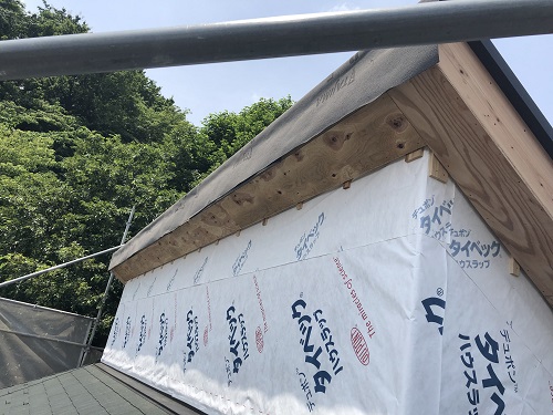 透湿防水シートや胴縁、水切り、軒天・破風材を設置していきます。